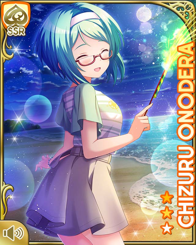 1girl :d beach brown_eyes card_(medium) closed_eyes collarbone dress fireworks full_moon girlfriend_(kari) glasses green_hair grey_dress headband moon night official_art onodera_chizuru open_mouth outdoors qp:flapper red-framed_eyewear shirt short_hair smile solo standing striped_clothes white_headband white_shirt