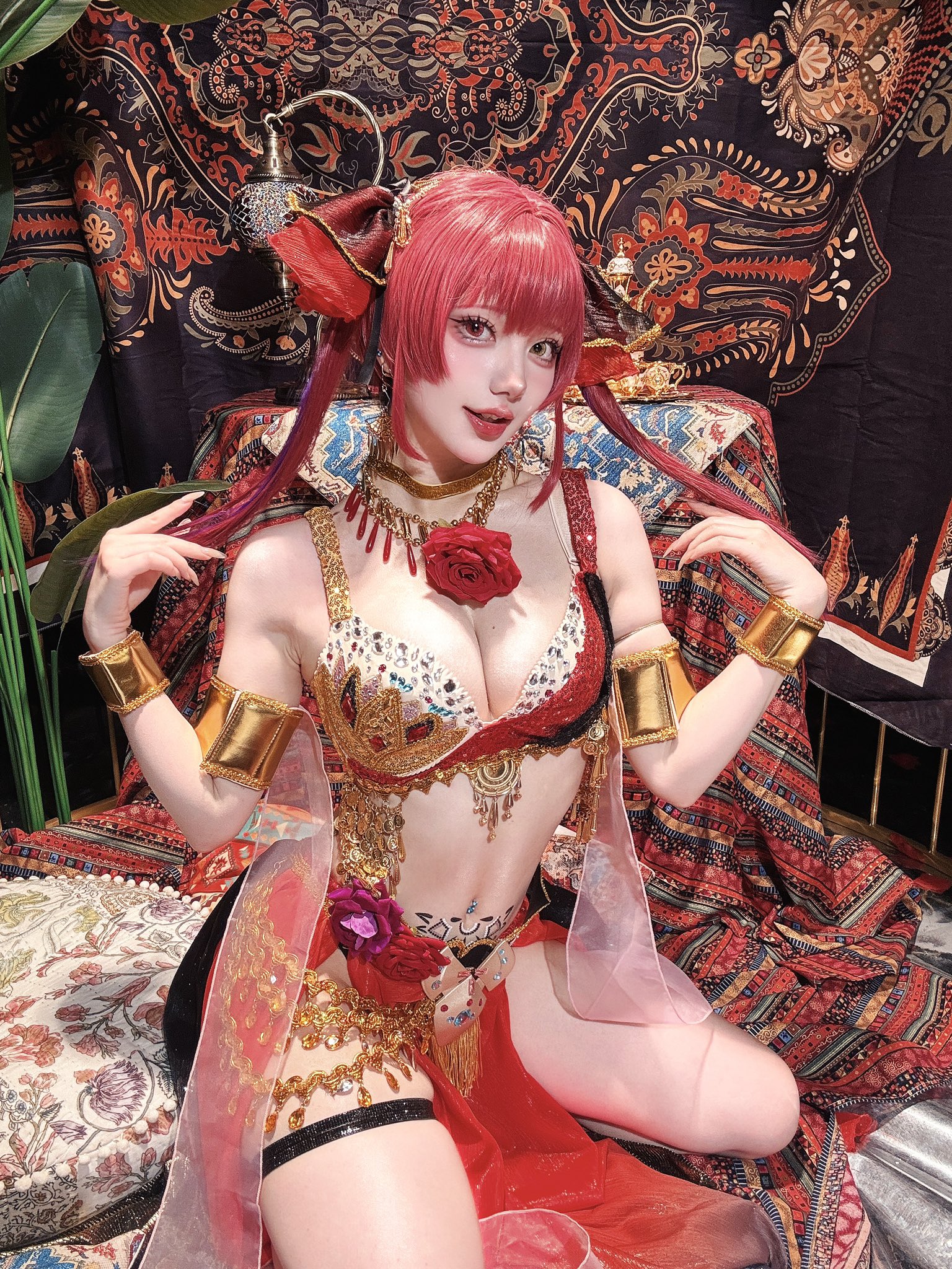 1girl belly_dancer breasts cleavage cosplay flower heterochromia highres hololive houshou_marine indian_clothes japanese_(nationality) kneeling kusa_cos large_breasts real_life red_hair rose twintails virtual_youtuber