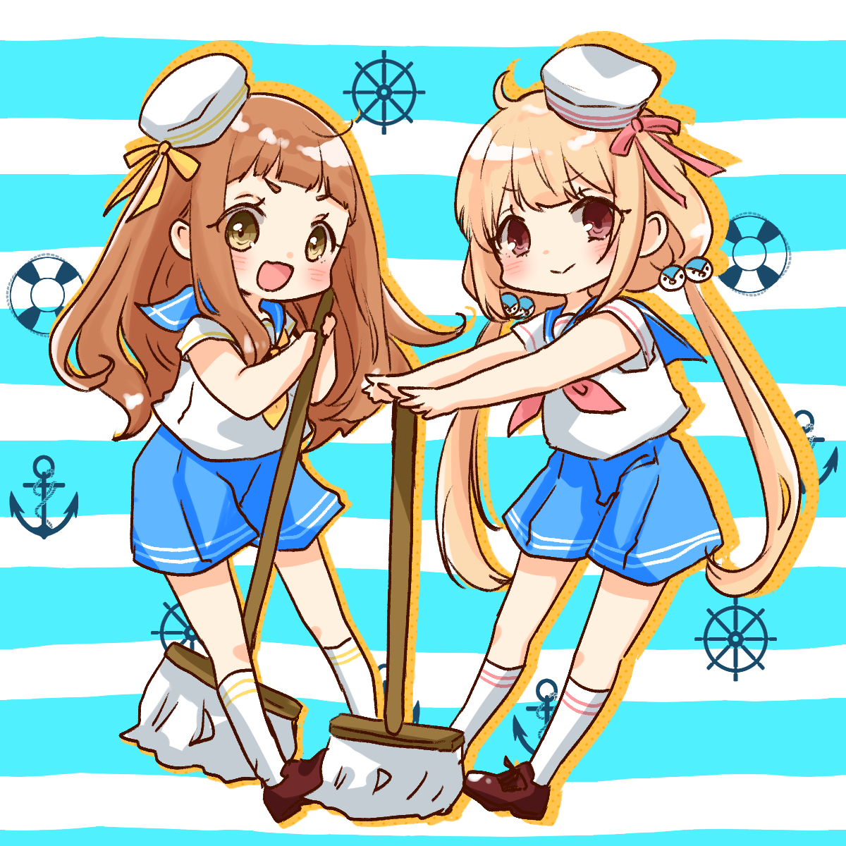 2girls :d blonde_hair blue_sailor_collar blue_shorts blush bow brown_eyes brown_hair brown_shoes chibi commentary_request drop_shadow futaba_anzu hat highres holding holding_mop ichihara_nina idolmaster idolmaster_cinderella_girls idolmaster_cinderella_girls_starlight_stage loafers low_twintails mini_hat mop multiple_girls open_mouth pink_bow rino_cnc sailor_collar sailor_hat shirt shoes short_eyebrows shorts smile socks striped_background thick_eyebrows twintails v-shaped_eyebrows white_hat white_shirt white_socks yellow_bow