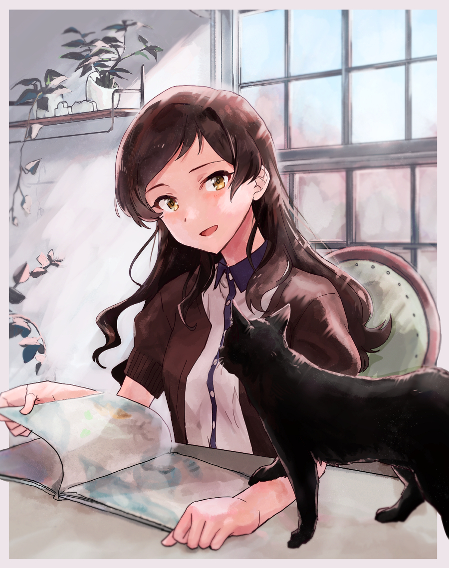 1girl animal black_cat book border brown_eyes brown_hair cat chair idolmaster idolmaster_million_live! indoors kitazawa_shiho long_hair on_chair open_book open_mouth outside_border plant potted_plant shirop_imas short_sleeves sitting smile solo white_border window