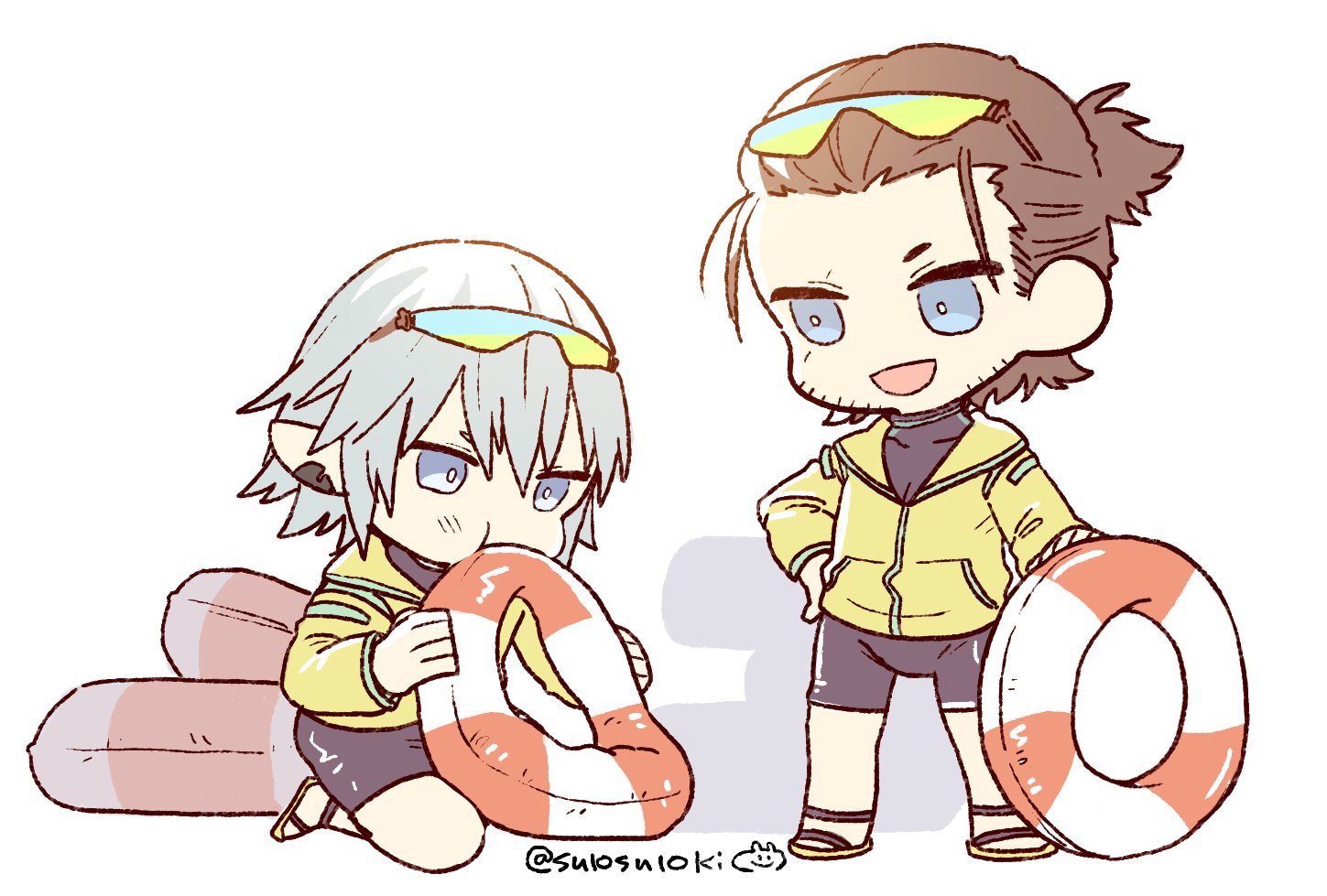 2boys :d adventurer_(ff14) beard_stubble blowing blue_eyes brown_hair chibi chibi_only elezen elf eyewear_on_head facial_hair final_fantasy final_fantasy_xiv half_updo haurchefant_greystone hyur jacket lifebuoy looking_at_another male_focus male_swimwear multiple_boys open_mouth pointy_ears simple_background smile stubble su10su10ki sunglasses swim_ring twitter_username warrior_of_light_(ff14) white_background yellow_jacket