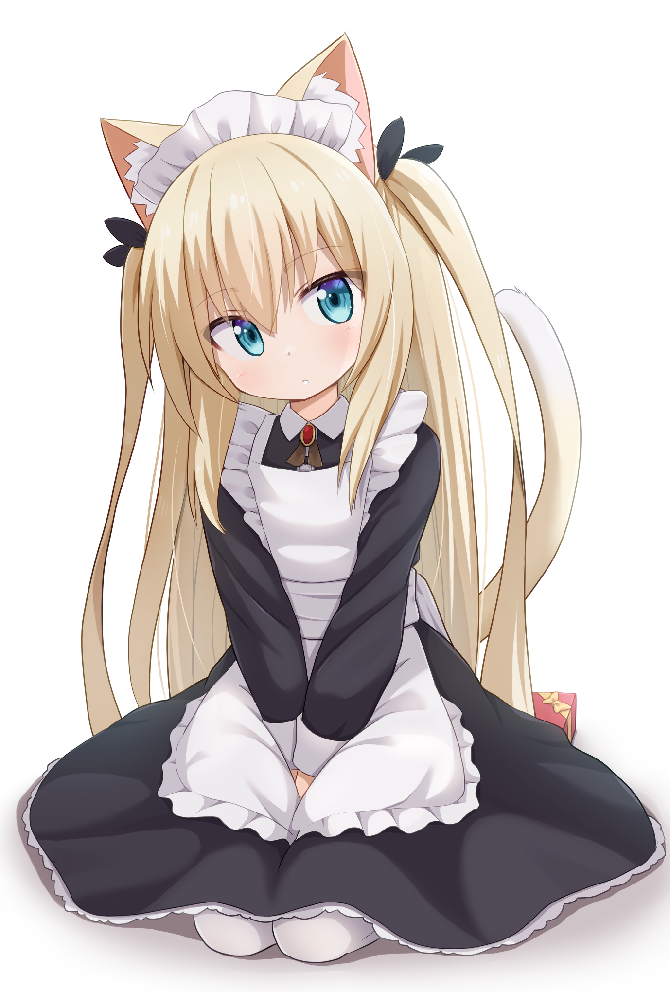 1girl animal_ears black_dress blonde_hair blue_eyes box cat_ears cat_girl cat_tail dress full_body gift gift_box highres maid maid_headdress medium_dress mii_(mogura2009) mogura2009 original own_hands_together panties seiza sitting solo tail two_side_up underwear white_panties