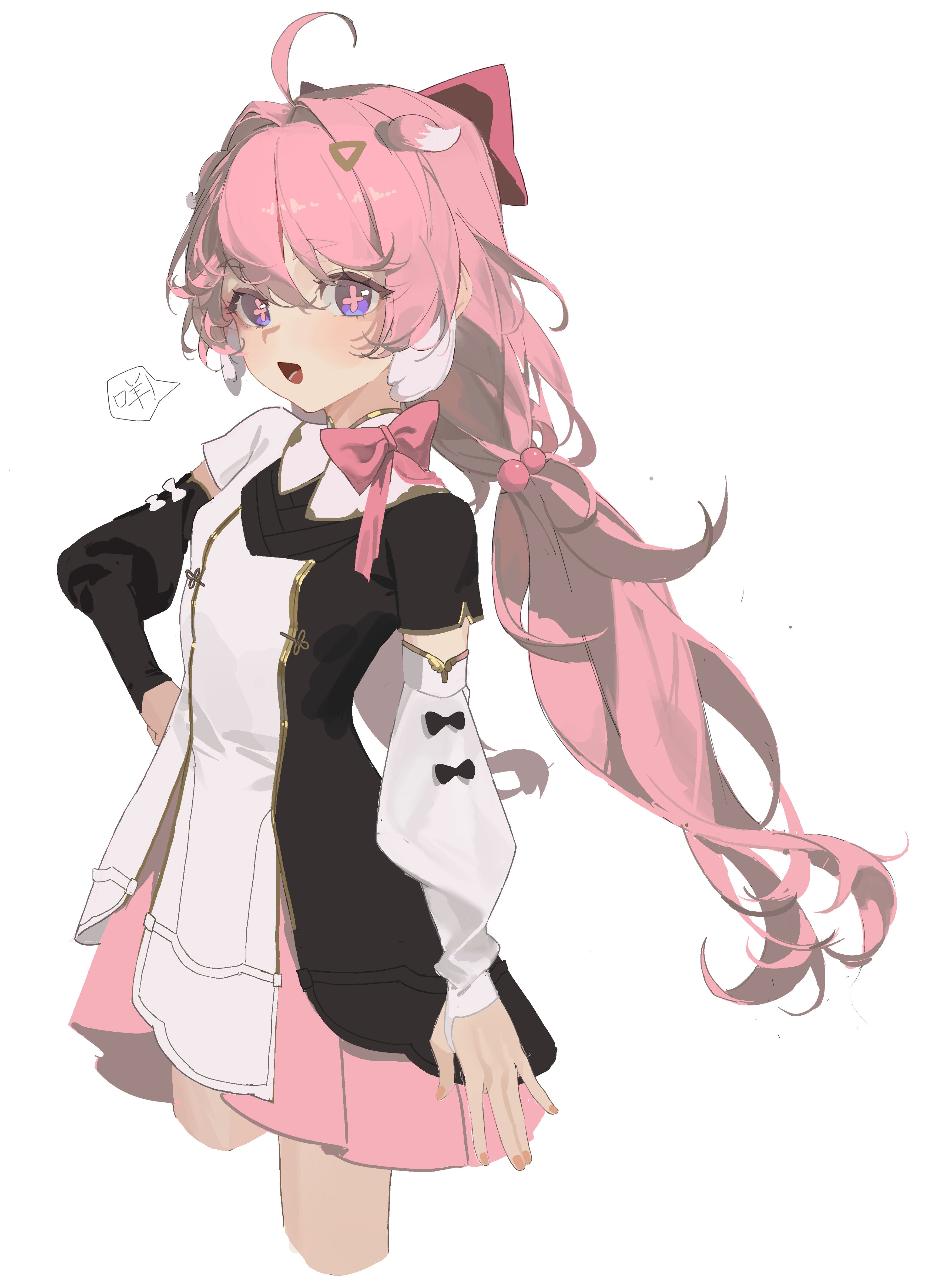 1girl absurdres ahoge blush bow cowboy_shot cropped_legs detached_sleeves dress encore_(wuthering_waves) hair_between_eyes hair_bow hair_ornament hand_on_own_hip highres long_hair long_sleeves looking_at_viewer low_twintails mercer_lll open_mouth pink_bow pink_hair puffy_sleeves purple_eyes red_bow shirt simple_background skirt solo standing twintails very_long_hair white_background wuthering_waves