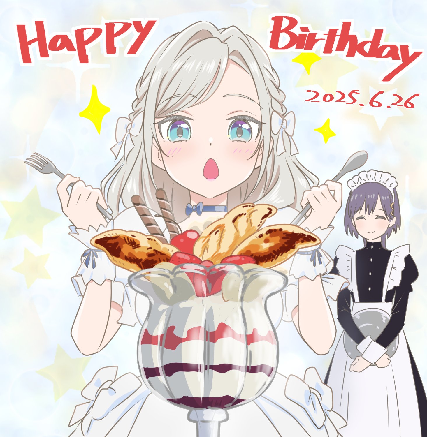 2girls ^_^ alternate_costume blue_eyes bow braid ceras_yanagida_lilienfeld chestnut_mouth closed_eyes closed_mouth commentary_request dated dress edel_note enmaided food fork frilled_sleeves frills fruit grey_hair hagisiri_kuma hair_bow happy_birthday highres holding holding_fork holding_spoon izayoi_selene katsuragi_izumi link!_like!_love_live! long_hair looking_at_food love_live! maid multiple_girls official_alternate_costume open_mouth parfait puffy_short_sleeves puffy_sleeves short_sleeves side_braids smile sparkle split_mouth spoon strawberry virtual_youtuber wafer_stick white_bow white_dress
