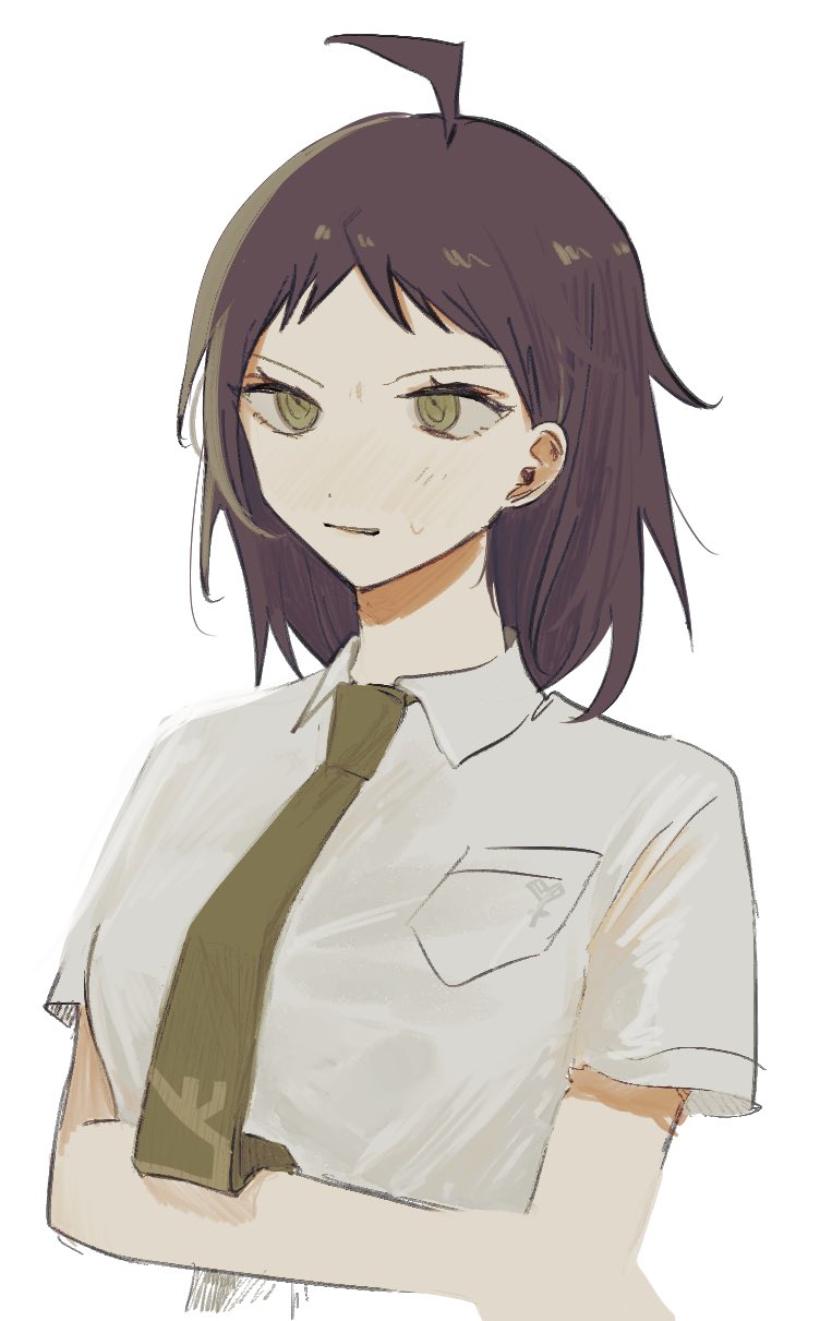 1girl ahoge breast_pocket collared_shirt danganronpa_(series) danganronpa_2:_goodbye_despair disgust genderswap genderswap_(mtf) green_eyes green_necktie grimace highres hinata_hajime looking_at_viewer necktie oji-sama_(ochi4t) pocket ringed_eyes shirt short_sleeves simple_background solo upper_body white_background white_shirt