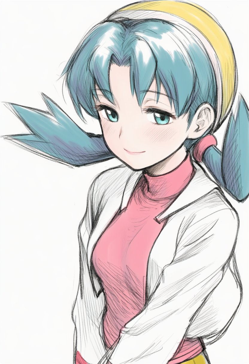 1girl aqua_eyes aqua_hair breasts closed_mouth cropped_jacket hairband highres jacket jaydamon kris_(pokemon) light_blush long_hair low_twintails medium_breasts nintendo parted_bangs pink_shirt pokemon pokemon_gold/silver/crystal shirt smile solo sweater turtleneck turtleneck_sweater twintails v_arms white_background white_jacket yellow_hairband