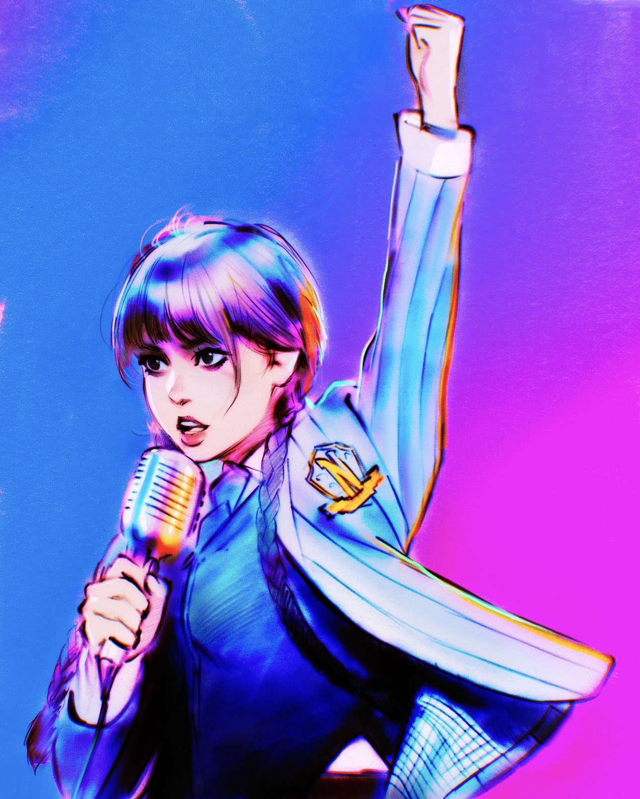 1girl the_addams_family black_hair black_necktie black_shirt blunt_bangs braid breasts clenched_hand collared_shirt hand_up highres holding holding_microphone ilya_kuvshinov jacket long_hair medium_breasts microphone necktie open_mouth school_uniform shirt solo striped_clothes striped_jacket twin_braids upper_body wednesday_(netflix) wednesday_addams