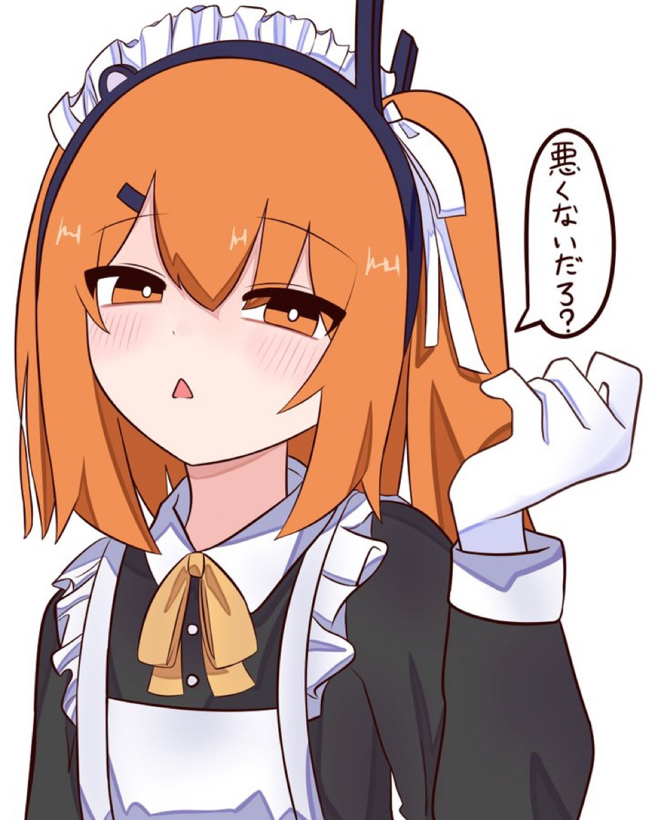 1girl adachi_rei alternate_costume apron black_dress blush dress enmaided frilled_apron frills gloves hair_ribbon hand_up long_sleeves looking_at_viewer maid maid_headdress medium_hair one_side_up orange_eyes orange_hair ribbon rirurima25 solo speech_bubble triangle_mouth upper_body utau white_apron white_background white_gloves