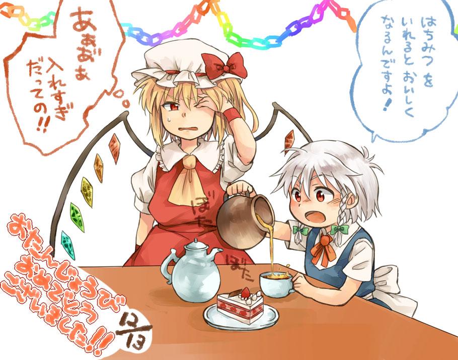 2girls aged_down ascot back_bow blonde_hair bow bowtie braid cake cake_slice chain child collared_shirt commentary_request crystal crystal_wings cup flandre_scarlet food frilled_shirt_collar frills green_bow grey_hair hair_bow hat hat_bow hijiki_(hijiri_st) honey izayoi_sakuya long_hair maid mob_cap multicolored_wings multiple_girls open_mouth plate pouring rainbow_gradient red_bow red_bowtie red_eyes red_skirt red_vest shirt short_sleeves skirt skirt_set speech_bubble sweatdrop tea teacup teapot thought_bubble touhou translation_request twin_braids vest white_bow white_hat white_shirt wings wrist_cuffs yellow_ascot