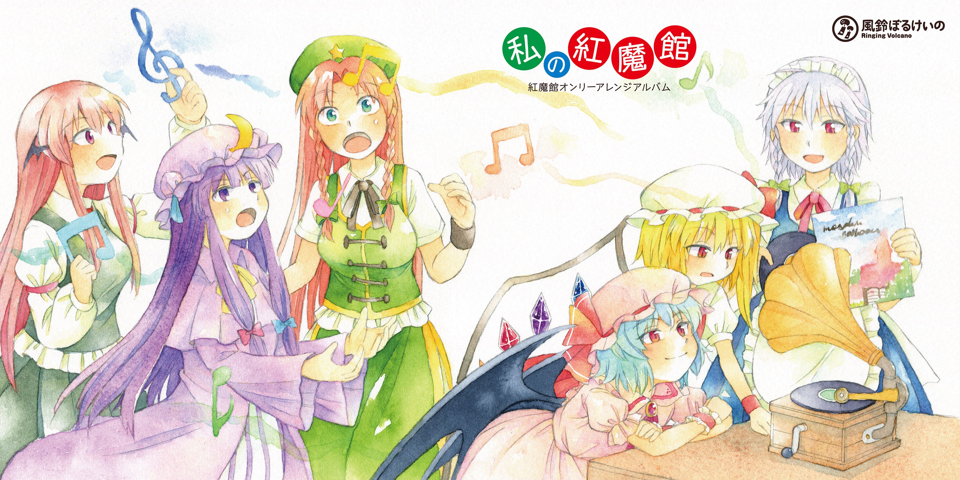 6+girls absurdres album_cover apron ascot bat_wings black_bow black_bowtie black_skirt black_vest blonde_hair blue_hair blush bow bowtie braid breasts brooch capelet circle_name closed_mouth collared_shirt commentary_request cover crescent crescent_hat_ornament crossed_arms crystal crystal_wings demon_wings dress flandre_scarlet green_bow green_eyes green_hat green_vest grey_hair hair_bow hat hat_ornament hat_ribbon head_wings highres hijiki_(hijiri_st) hong_meiling izayoi_sakuya jewelry koakuma long_hair long_sleeves maid maid_headdress mob_cap multicolored_wings multiple_girls musical_note one_side_up open_mouth patchouli_knowledge phonograph pink_hat pink_shirt pink_skirt purple_capelet purple_dress purple_eyes purple_hair purple_hat red_ascot red_eyes red_hair red_ribbon red_vest remilia_scarlet ribbon ringing_volcano shirt short_sleeves siblings side_slit sisters skirt skirt_set smile star_(symbol) star_hat_ornament striped_clothes striped_dress sweatdrop touhou twin_braids vertical-striped_clothes vertical-striped_dress very_long_hair vest waist_apron white_hat white_shirt wide_sleeves wings wrist_cuffs