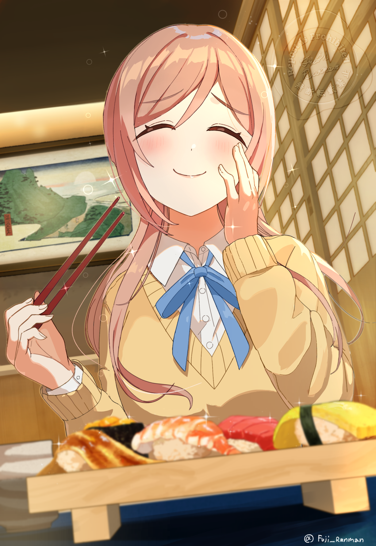 1girl blue_ribbon blush braid brown_hair chopsticks closed_eyes eating fingernails food foodgasm fuji_ranman gakuen_idolmaster hand_on_own_cheek hand_on_own_face highres himesaki_rinami holding holding_chopsticks idolmaster indoors long_hair long_sleeves neck_ribbon ribbon shirt smile solo sushi sweater twin_braids very_long_hair white_shirt yellow_sweater