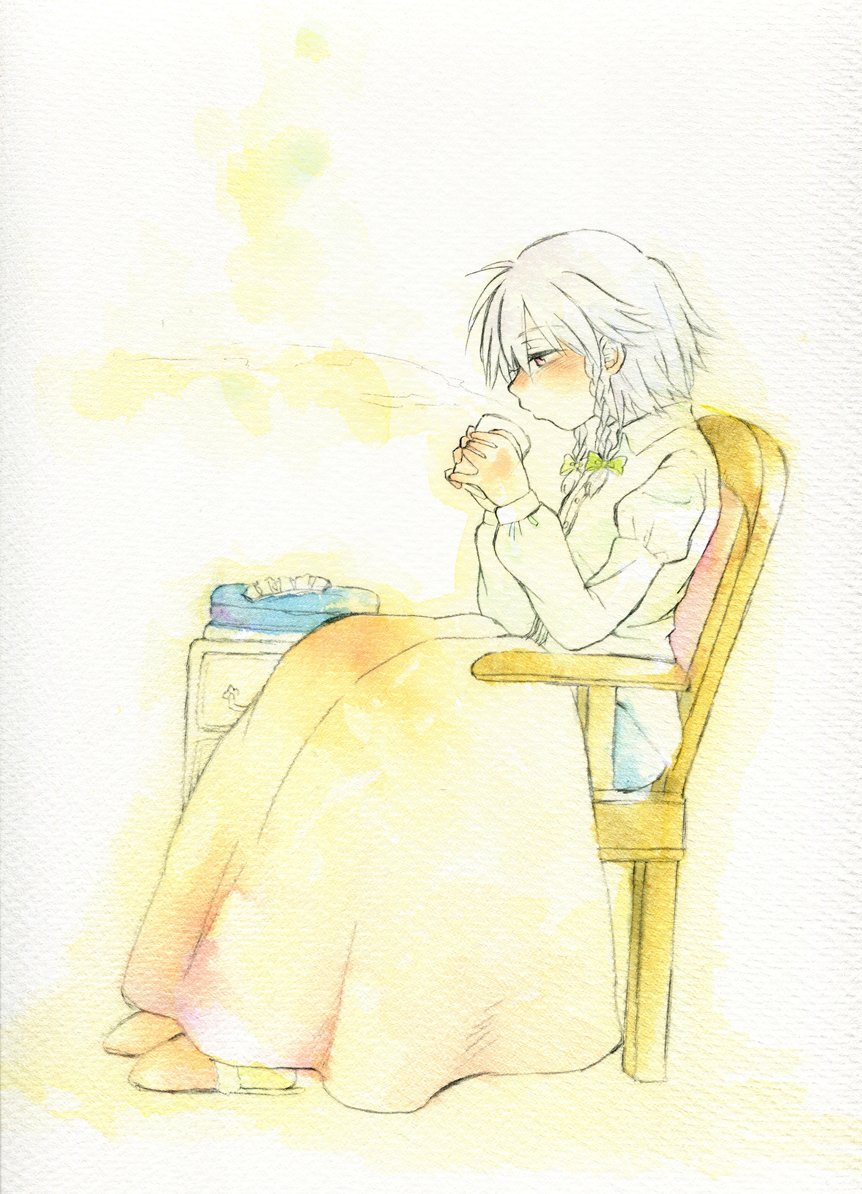 1girl blanket blowing bow braid chair collared_shirt commentary_request cup green_bow grey_hair hair_bow hijiki_(hijiri_st) holding holding_cup izayoi_sakuya long_hair long_sleeves on_chair one-hour_drawing_challenge red_eyes shirt sitting slippers solo steam touhou twin_braids white_shirt