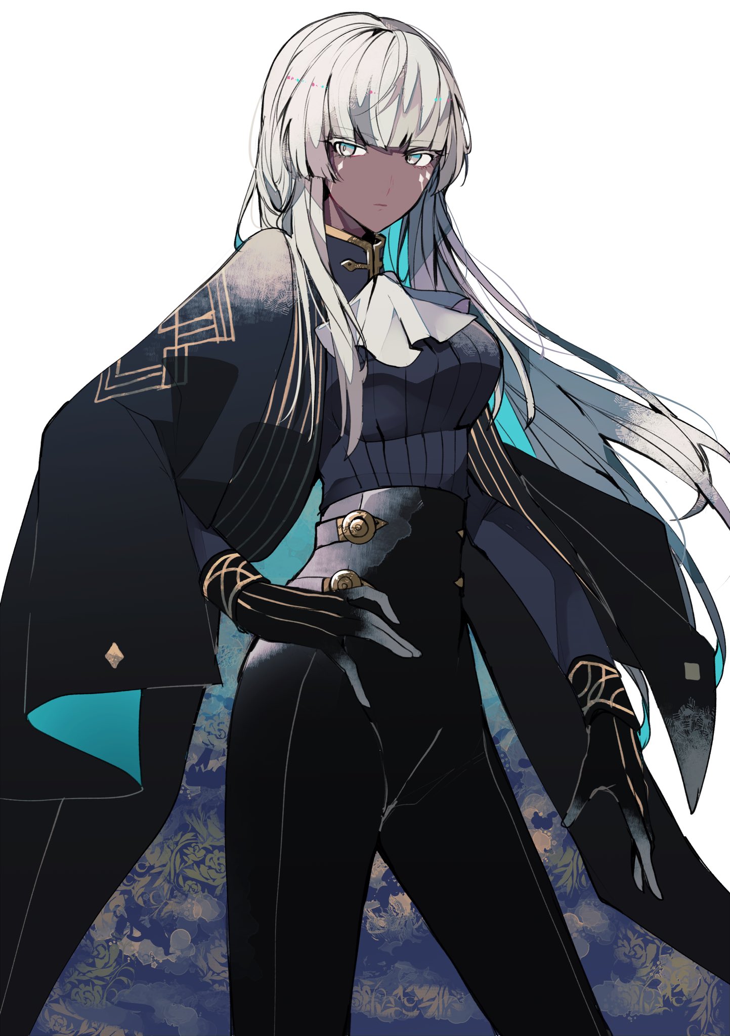 1girl ascot black_gloves black_jacket black_pants blue_eyes breasts brigitta_(metaphor:_refantazio) dark-skinned_female dark_skin expressionless facial_mark floating_hair gloves grey_background grey_hair highres hime_cut jacket jacket_on_shoulders long_hair looking_at_viewer medium_breasts metaphor:_refantazio pants simple_background solo teketeke_(tasutekete) white_ascot