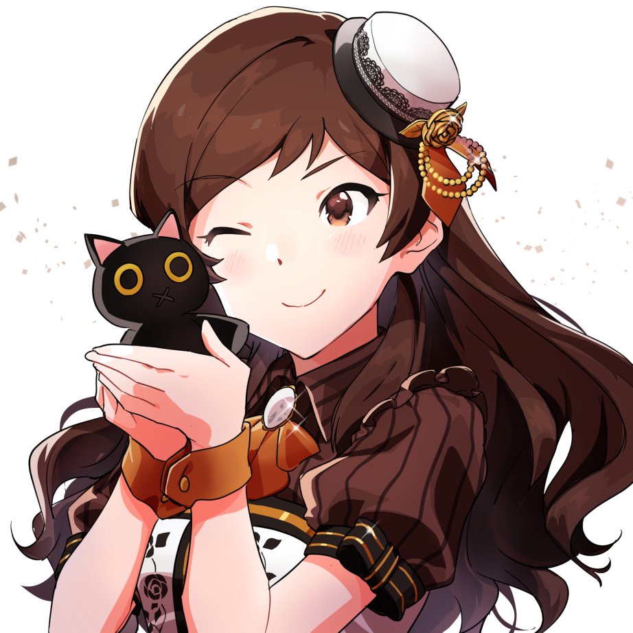 1girl brown_eyes brown_hair closed_mouth hat holding holding_stuffed_toy idolmaster idolmaster_million_live! idolmaster_million_live!_theater_days kitazawa_shiho kitazawa_shiho_(chocolate_rose) light_blush long_hair mini_hat official_alternate_costume one_eye_closed puffy_short_sleeves puffy_sleeves shirop_imas short_sleeves simple_background smile solo stuffed_animal stuffed_cat stuffed_toy upper_body white_background white_hat wrist_cuffs