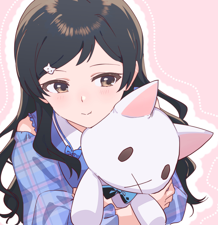 1girl black_hair brown_eyes cat_hair_ornament closed_mouth hair_ornament holding holding_stuffed_toy idolmaster idolmaster_million_live! idolmaster_million_live!_theater_days kitazawa_shiho light_blush long_hair long_sleeves official_alternate_hair_color plaid_clothes shirop_imas smile solo stuffed_animal stuffed_cat stuffed_toy upper_body