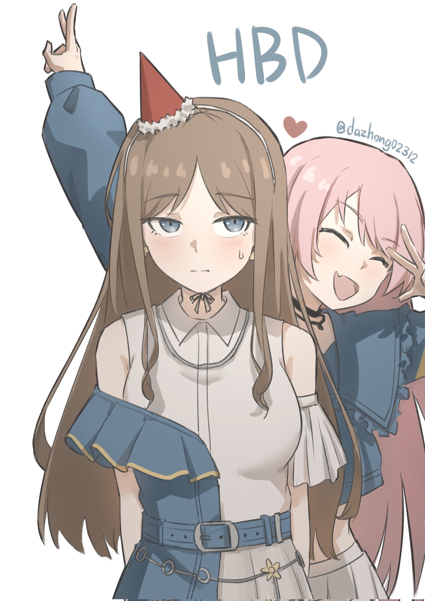 2girls arm_up bang_dream! bang_dream!_it's_mygo!!!!! blue_eyes blue_jacket blush breasts brown_hair chihaya_anon chinese_commentary closed_eyes closed_mouth commentary_request corrupted_twitter_file dazhong_(dazhong02312) detached_sleeves dress fang happy_birthday hat heart highres jacket large_breasts long_hair midriff multiple_girls nagasaki_soyo open_mouth party_hat pink_hair sidelocks simple_background skin_fang sweatdrop twitter_username v w white_background white_dress