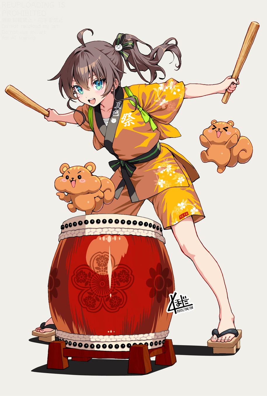 1girl :d ahoge black_ribbon blush brown_hair brown_sandals commentary_request dated full_body geta green_eyes grey_background hair_ribbon highres holding hololive japanese_clothes kimono kubota_masaki long_hair looking_at_viewer natsuiro_matsuri open_mouth ponytail ribbon sandals short_sleeves shorts signature simple_background smile solo standing virtual_youtuber yellow_kimono yellow_shorts