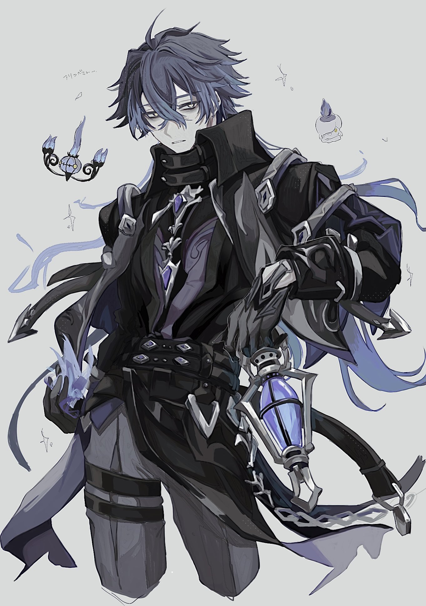 1boy antenna_hair bags_under_eyes belt black_belt black_gloves black_jacket black_shirt blue_hair chandelure closed_mouth collared_jacket commentary cropped_legs crossed_bangs double-parted_bangs empty_eyes flins_(genshin_impact) floating_hair gem gen_5_pokemon genshin_impact gloves grey_pants hair_between_eyes hashtag-only_commentary highres holding holding_lantern jacket lantern litwick long_hair long_sleeves looking_to_the_side male_focus nintendo pants parted_lips pokemon pokemon_(creature) shirt sideways_glance sleeve_cuffs solo thigh_belt thigh_strap u2xoz wing_collar yellow_eyes