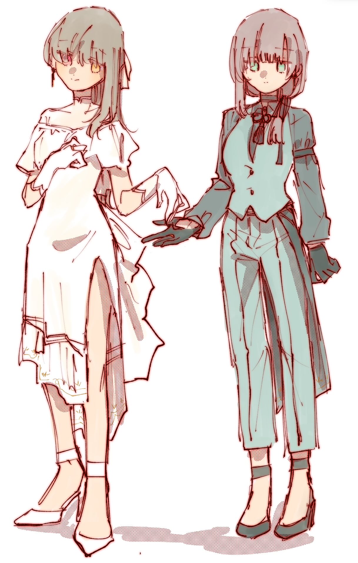 2girls alternate_hairstyle arm_at_side assault_lily black_hair black_ribbon brown_hair buttons closed_mouth collared_shirt commentary dress earrings flower_knot formal_clothes full_body gloves green_eyes green_gloves green_pants green_shirt green_shoes green_vest hair_between_eyes hair_over_shoulder hair_ribbon hand_on_own_chest hand_up hands_up head_tilt heterochromia high_heels highres imminent_hand_holding jewelry kuo_shenlin light_smile long_sleeves looking_at_viewer multiple_girls neck_tassel no_pupils off-shoulder_dress off_shoulder open_hand pants pink_eyes ribbon ring rui_rui_rui0122 shirt shoes short_sleeves side_slit simple_background sleeve_garter standing strappy_heels tassel vest waist_cape wang_yujia white_background white_dress white_gloves white_ribbon white_shoes