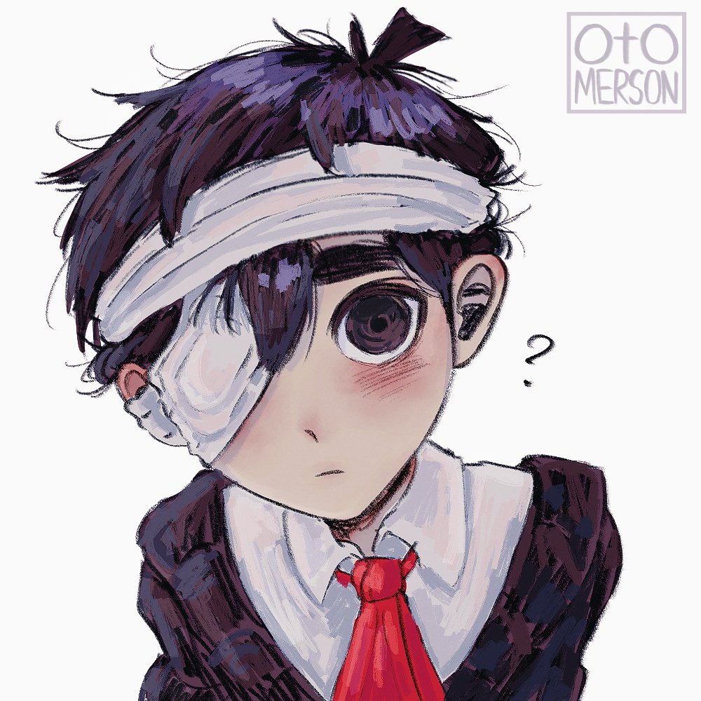 1boy ? alternate_costume antenna_hair artist_name bandaged_head bandages black_eyes black_hair blush closed_mouth collared_shirt eyepatch looking_at_viewer male_focus medical_eyepatch omori otomerson shirt short_hair simple_background solo spoilers sunny_(omori) upper_body white_background white_shirt