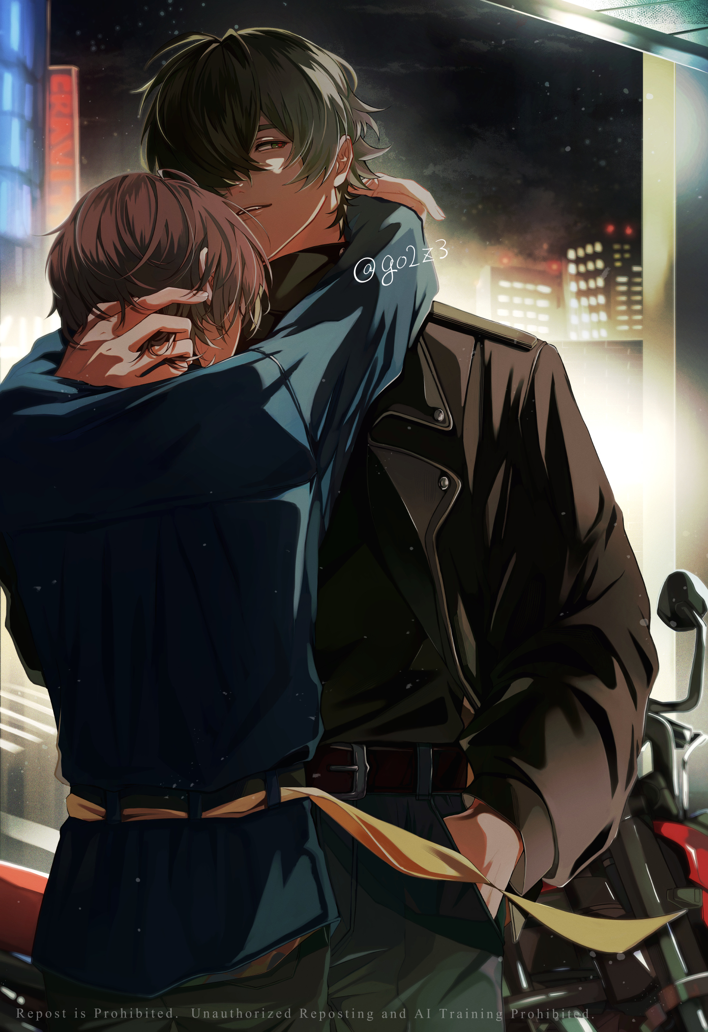 2boys arms_around_neck belt belt_buckle black_belt black_jacket black_pants black_shirt blue_jacket buckle gogo_(go2z3) green_eyes green_hair grey_hair hair_over_one_eye hand_in_another's_hair hand_in_pocket highres jacket leather leather_jacket lighter_(zenless_zone_zero) long_sleeves motor_vehicle motorcycle multiple_boys night official_alternate_costume pants shirt smile turtleneck turtleneck_shirt wise_(zenless_zone_zero) yaoi yellow_belt zenless_zone_zero