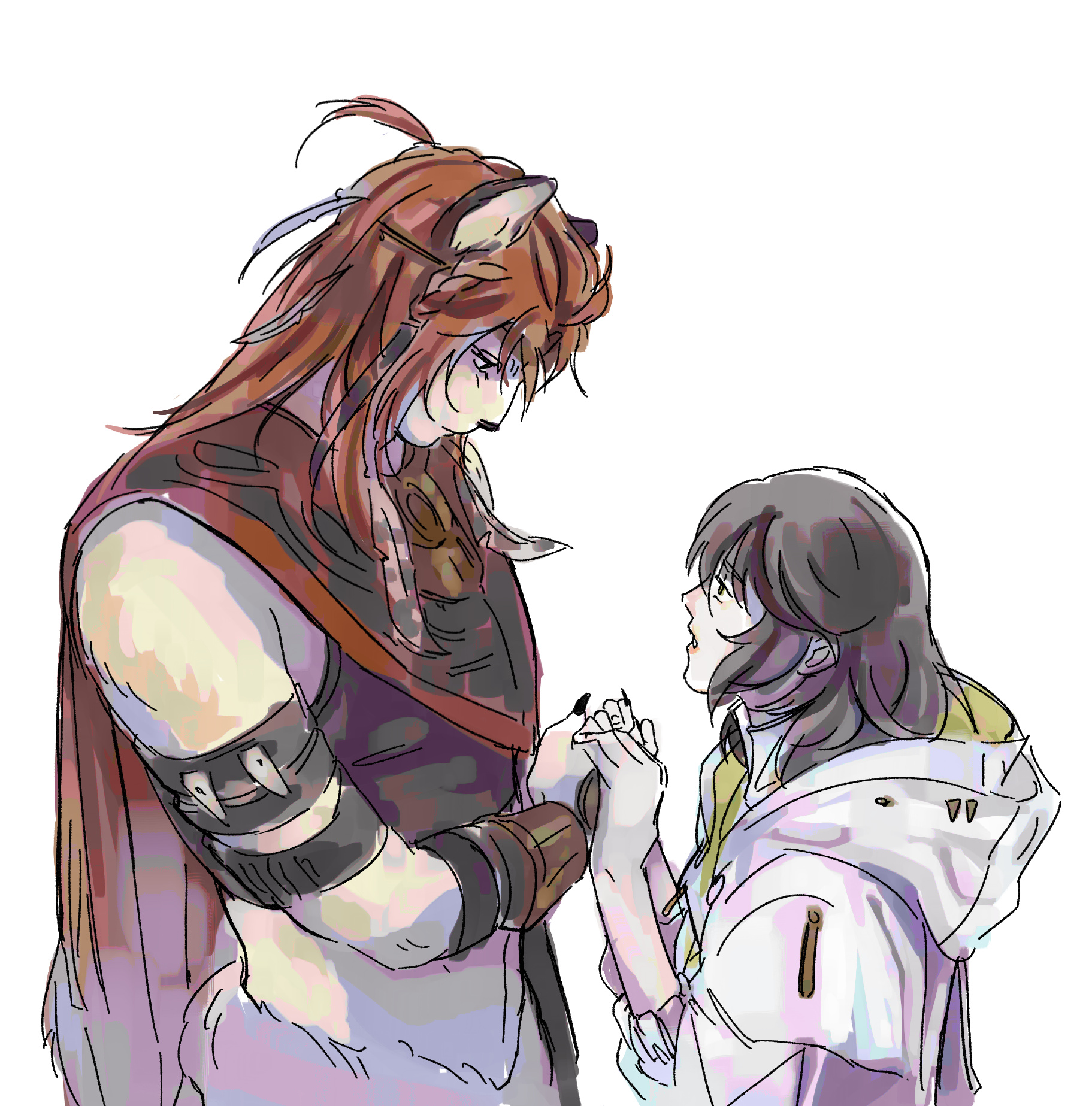 2girls animal_ears brown_hair cape circlet esshemasha eye_contact feather_hair_ornament feathers final_fantasy final_fantasy_xiv fingernails hair_ornament highres holding_hands hood hoodie hrothgar hyur lion_ears lion_girl long_fingernails looking_at_another multiple_girls orange_hair sharp_fingernails sphene_(ff14) wuk_lamat
