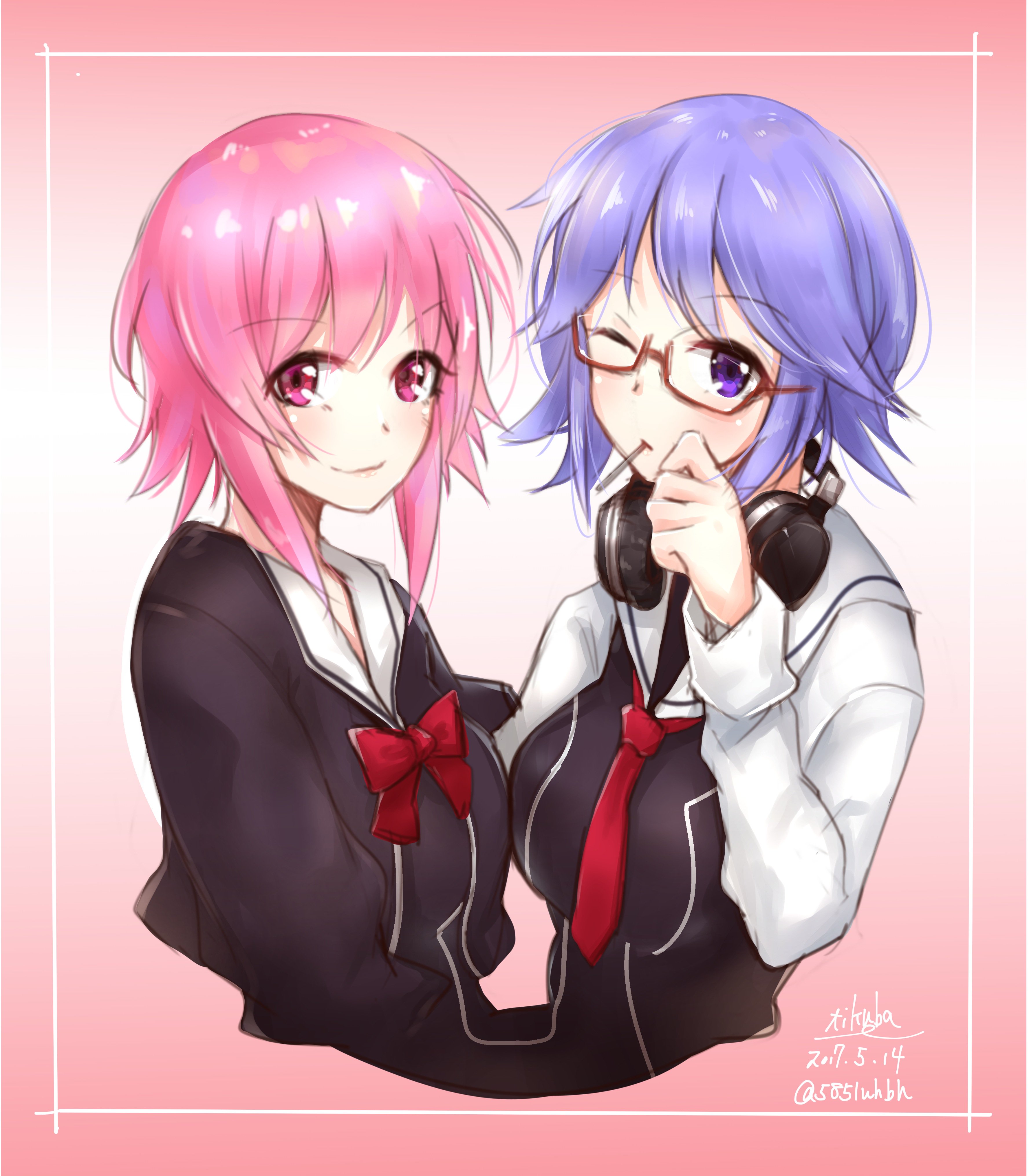 2017 2girls absurdres blue_hair blush bow breasts buttons chaos;child chest_bow cropped_jacket dated double-breasted dress_vest food_in_mouth glasses headphones headphones_around_neck highres kazuki_hana light_blush lollipop_in_mouth long_sleeves looking_at_viewer medium_breasts miniskirt multiple_girls necktie no_jacket one_eye_closed onoe_serika pink_eyes pink_hair purple_eyes red_bow red_necktie sailor_collar sailor_shirt school_uniform science_adventure shiny_skin shirt short_hair short_hair_with_long_locks short_necktie skirt smile upper_body white_sailor_collar yakku