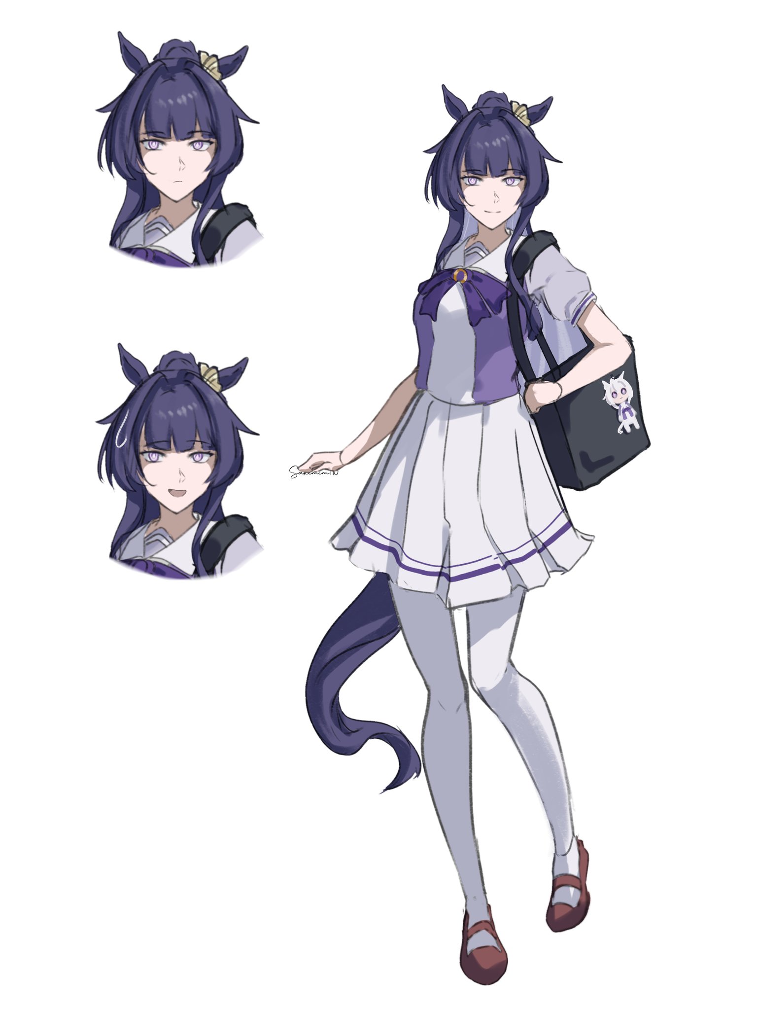 1girl :d ahoge animal_ears bag bow bowtie closed_mouth commentary english_commentary full_body highres honkai_(series) honkai_impact_3rd horse_ears kiana_kaslana long_hair looking_at_viewer multiple_views open_mouth pantyhose pleated_skirt purple_bow purple_bowtie purple_eyes purple_hair purple_shirt raiden_mei raiden_mei_(herrscher_of_origin) sakimim school_uniform shirt shoulder_bag skirt smile tracen_school_uniform umamusume very_long_hair white_background white_pantyhose white_skirt