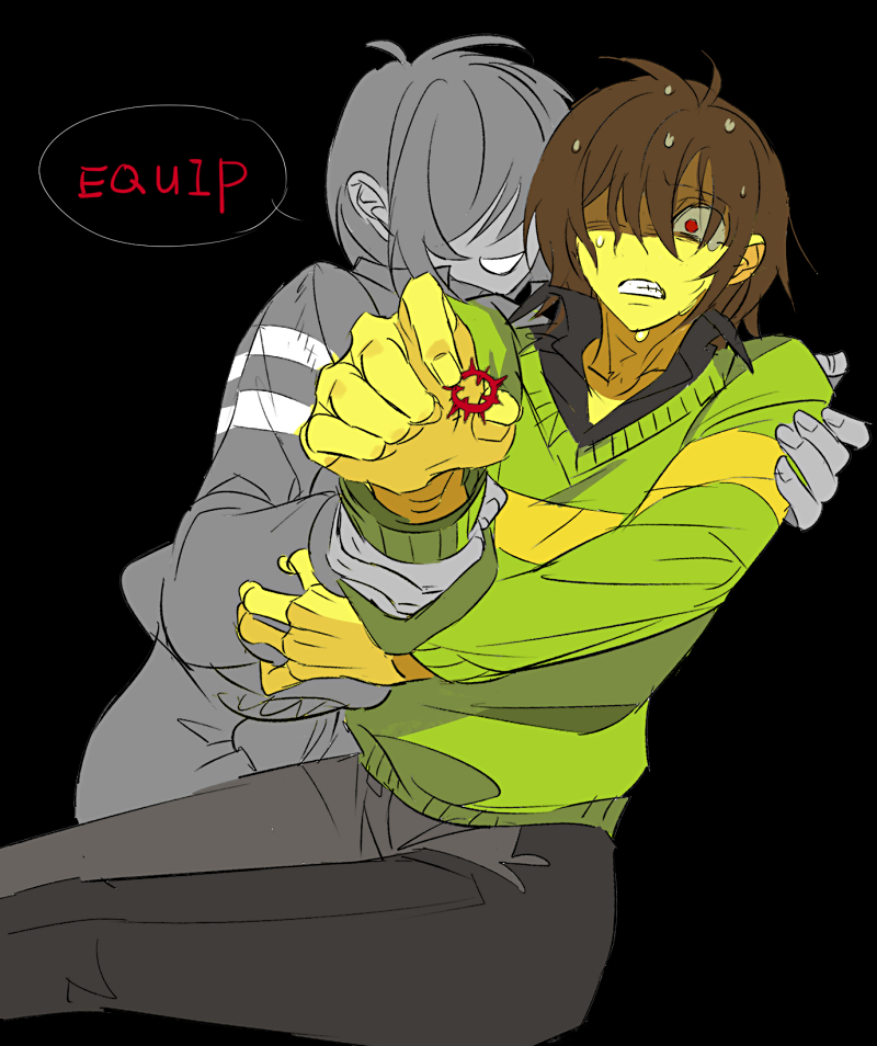 2others black_pants black_shirt brown_hair collared_shirt colored_skin commentary deltarune double_horizontal_stripe english_commentary english_text frown green_sweater grey_skin holding holding_jewelry holding_ring jewelry kris_(deltarune) multiple_others other_focus pants red_eyes ring shirt short_hair single_horizontal_stripe sitting smile striped_clothes striped_sweater sweat sweater thorn_ring_(deltarune) utdr_(toby_fox) vessel_(deltarune) weird_route_(deltarune) yellow_skin yichuan