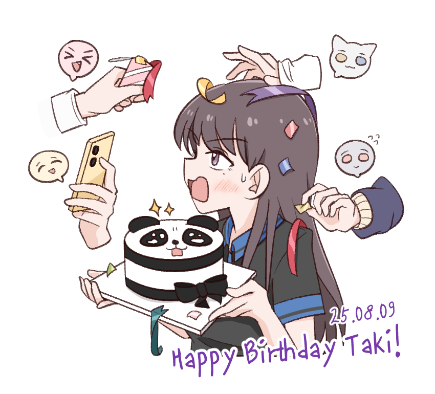 5girls bang_dream! bang_dream!_it's_mygo!!!!! birthday_cake black_hair black_shirt blush cake cellphone chihaya_anon commentary_request confetti dated food happy_birthday headpat holding holding_phone kaname_raana korean_commentary long_hair long_sleeves mole mole_under_eye multiple_girls mygo!!!!!_(bang_dream!) nagasaki_soyo open_mouth phone purple_eyes raana_the_cat saiaku_dan shiina_taki shirt short_sleeves simple_background smartphone solo_focus sweatdrop takamatsu_tomori white_background