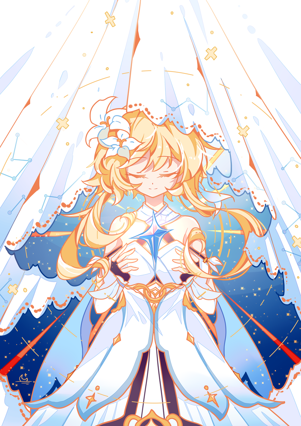 1girl bare_shoulders blonde_hair chinese_commentary closed_eyes closed_mouth commentary_request constellation constellation_print cowboy_shot curtains detached_sleeves dress duskorgan facing_viewer flower genshin_impact hair_between_eyes hair_flower hair_ornament hands_up highres long_hair lumine_(genshin_impact) sky smile solo standing star_(sky) starry_sky white_dress white_flower