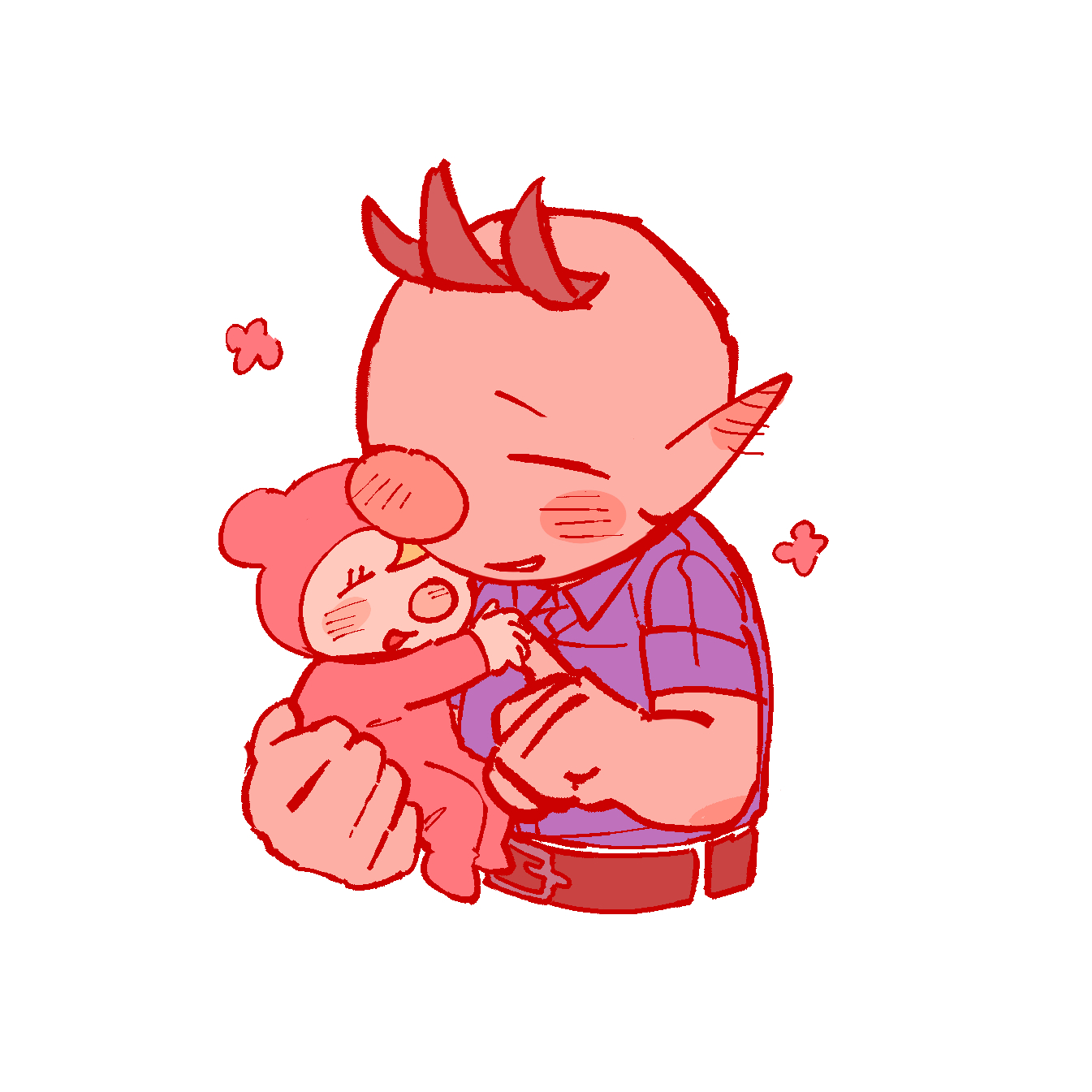 1boy 1girl ^_^ baby belt belt_buckle black_belt blonde_hair blue_shirt blush_stickers brown_hair buckle bun_cover carrying carrying_baby carrying_person casual child closed_eyes collared_shirt double_bun eyelashes father_and_child father_and_daughter flower hair_bun happy highres hood hood_up hooded_jumpsuit jumpsuit large_nose nintendo olimar olimar's_daughter onesie open_mouth parent_and_child parted_lips pikmin_(series) pink_flower pink_jumpsuit pointy_ears shirt short_hair short_sleeves simple_background smile very_short_hair white_background yu_pikmin