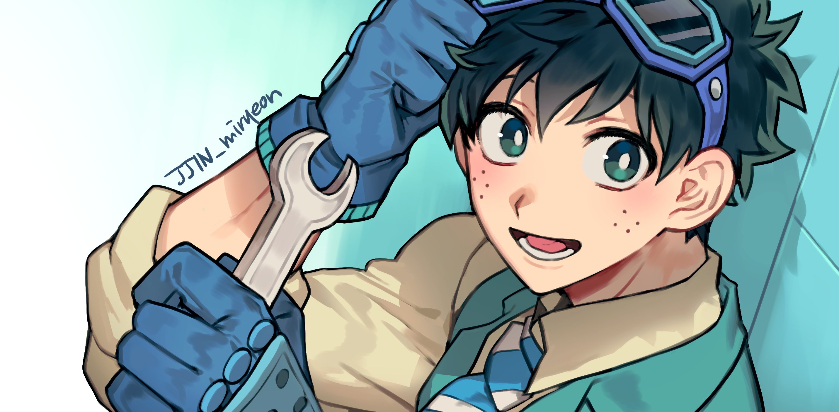 1boy blue_gloves boku_no_hero_academia bright_pupils brown_shirt freckles gloves goggles goggles_on_head green_eyes green_jacket highres holding holding_wrench jacket looking_at_viewer lower_teeth_only male_focus midoriya_izuku misa_(jjin_miryeon) necktie open_mouth shirt solo striped_clothes striped_necktie teeth white_pupils wrench