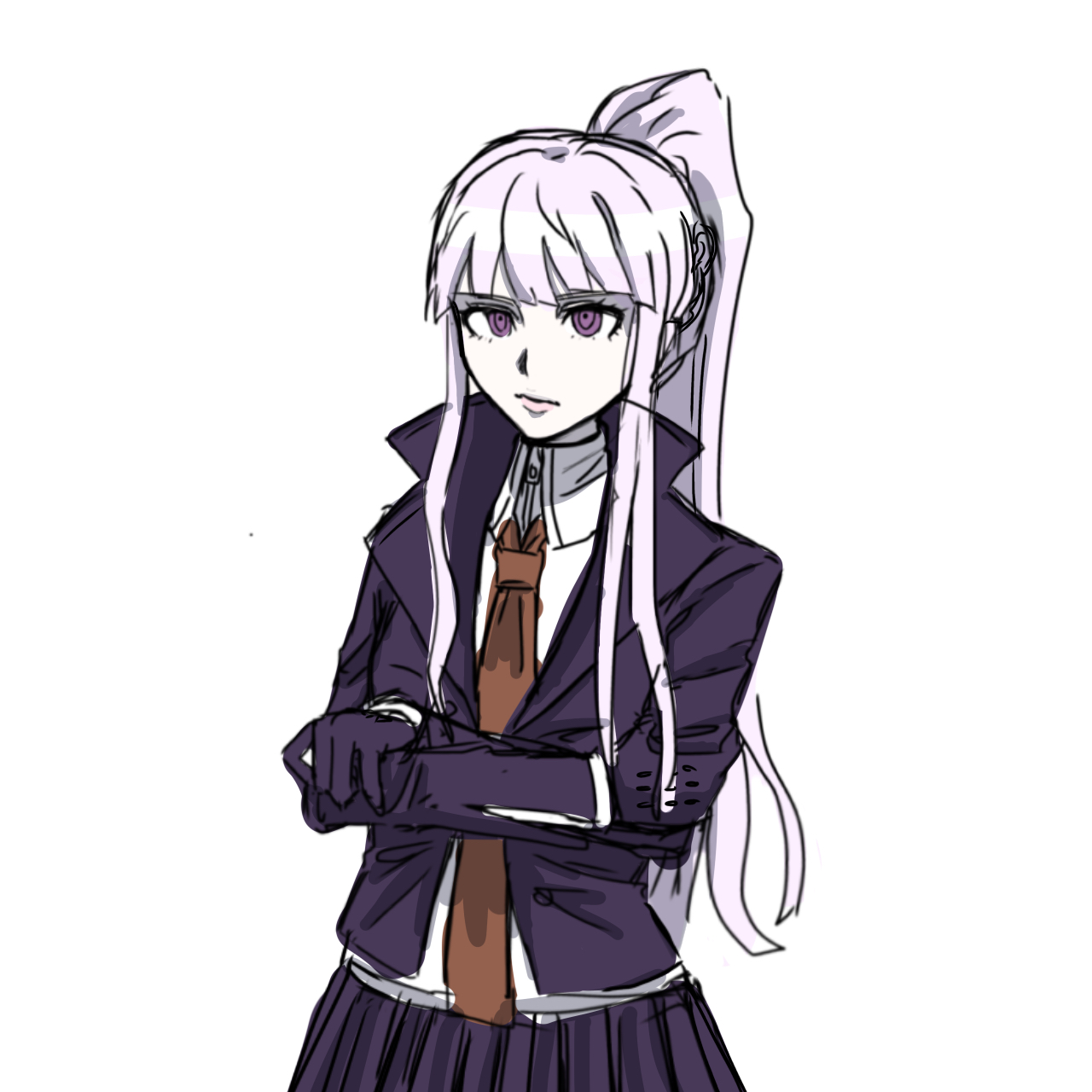 1girl black_jacket black_skirt brown_necktie collared_shirt cowboy_shot crossed_arms danganronpa:_trigger_happy_havoc danganronpa_(series) grey_hair highres jacket kirigiri_kyoko long_hair long_sleeves necktie open_clothes open_jacket pleated_skirt ponytail rari_wo shirt simple_background skirt solo white_background white_shirt