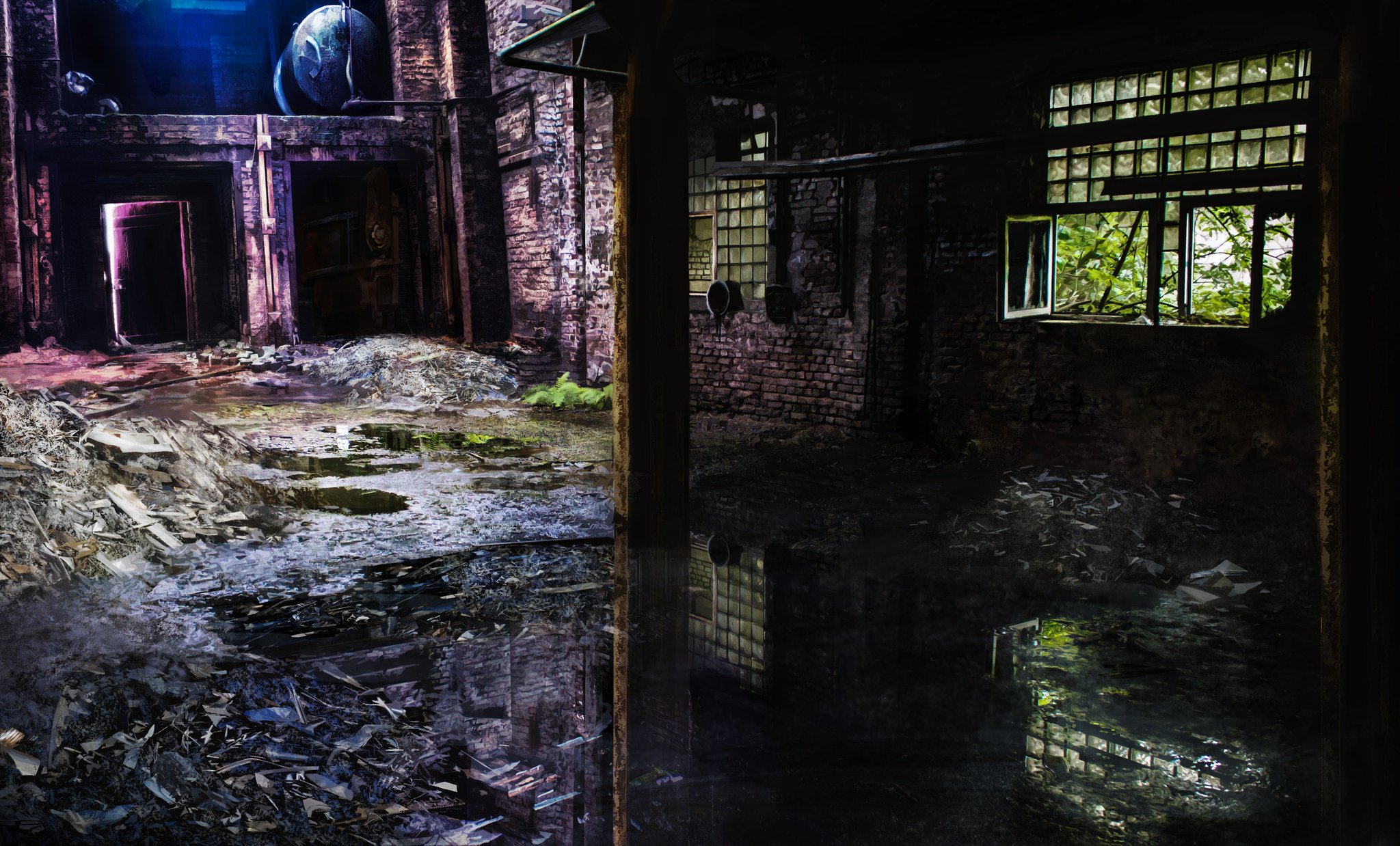 abandoned brick_wall building chinese_commentary commentary_request day highres indoors industrial original puddle realistic reflection reflective_liquid scenery water window zaq_(pgvc4472)