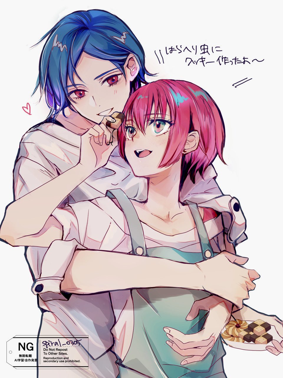 1boy 1girl amate_yuzuriha aqua_eyes blue_hair blush breasts colored_inner_hair cookie couple food gundam gundam_gquuuuuux hetero highres holding hug hug_from_behind multicolored_hair open_mouth purple_hair red_eyes red_hair shirt short_hair shuji_ito simple_background smile spiral_0305 two-tone_hair upper_body watermark white_background white_shirt