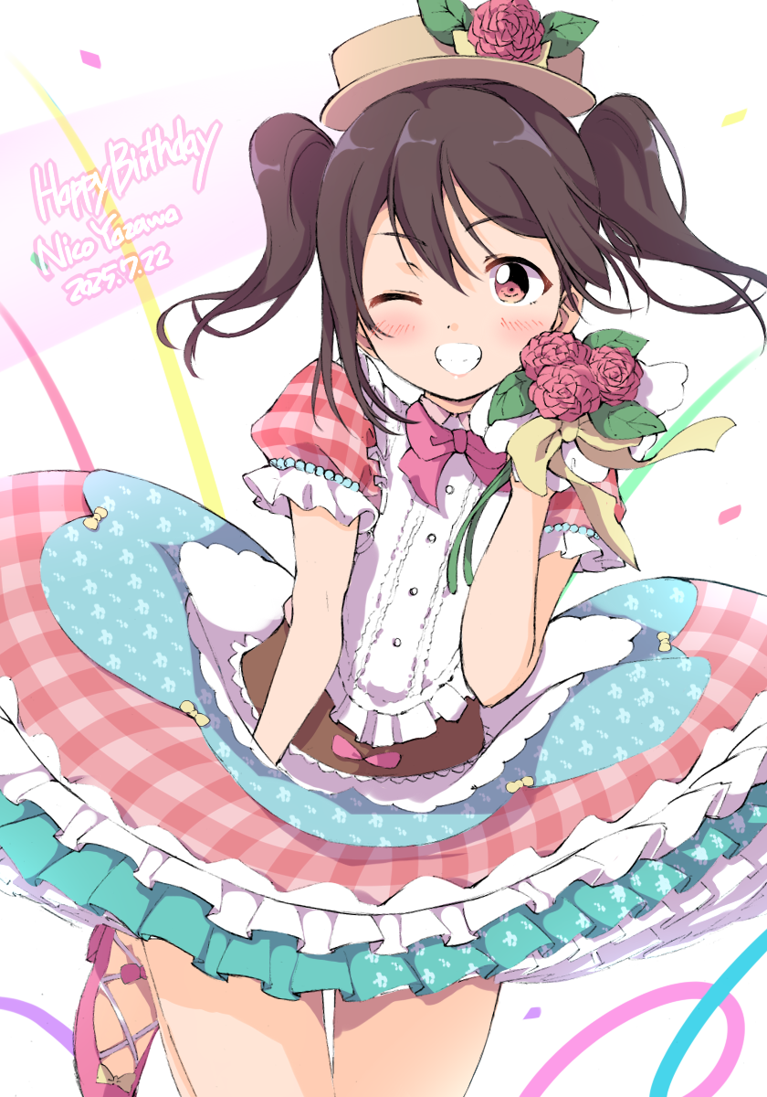 1girl black_hair blush bouquet brown_eyes character_name dated dress english_text flower grin happy_birthday hat highres holding holding_bouquet looking_at_viewer love_live! love_live!_school_idol_project multicolored_dress one_eye_closed pink_flower puffy_short_sleeves puffy_sleeves sen_(sen0910) short_sleeves smile solo twintails yazawa_nico