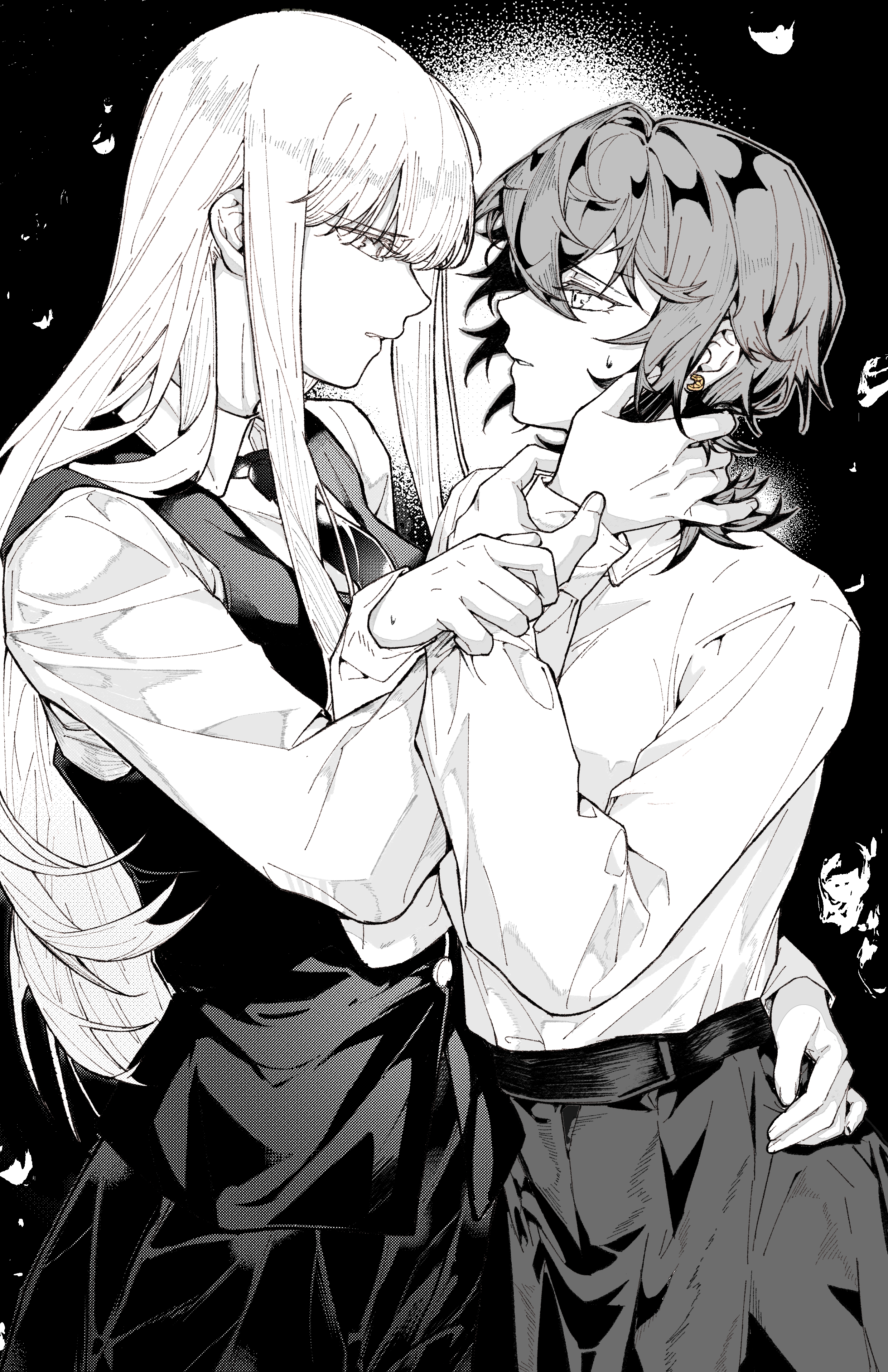 2girls absurdres asahina_yuni chinese_commentary commentary_request eye_contact hand_in_another's_hair hand_on_another's_hip haoxiangkan_nutong highres holding_another's_wrist kyou_wa_kanojo_ga_inai_kara long_hair looking_at_another monochrome multiple_girls school_uniform short_hair taki_fuuko