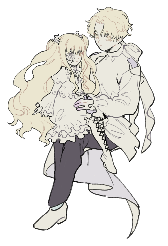 1boy 1girl alien_stage back_ribbon black_pants blonde_hair boots colored_extremities colored_eyelashes crossover dress flower flower_over_eye full_body invisible_chair itokin0 juliet_sleeves kirakishou lace-up_boots long_hair long_sleeves luka_(alien_stage) pants puffy_sleeves rose rozen_maiden shirt short_hair simple_background sitting sitting_on_lap sitting_on_person two_side_up very_long_hair white_background white_boots white_dress white_flower white_rose white_shirt yellow_eyes