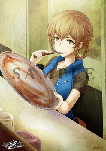 amane_suzuha amane_suzuha_(beta) belt belt_buckle blue_vest braid breasts brown_hair buckle eating green_shirt grey_pants hair_rings holding holding_plate hood hooded_vest hoodie huke looking_at_viewer lowres medium_breasts official_art pants plate sample_watermark science_adventure shirt steins;gate steins;gate_0 t-shirt twin_braids twintails vest watermark yellow_eyes