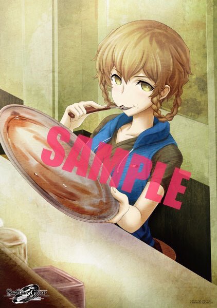 amane_suzuha amane_suzuha_(beta) belt belt_buckle blue_vest braid breasts brown_hair buckle eating green_shirt grey_pants hair_rings holding holding_plate hood hooded_vest hoodie huke looking_at_viewer medium_breasts official_art pants plate sample_watermark science_adventure shirt steins;gate steins;gate_0 t-shirt twin_braids twintails vest watermark yellow_eyes