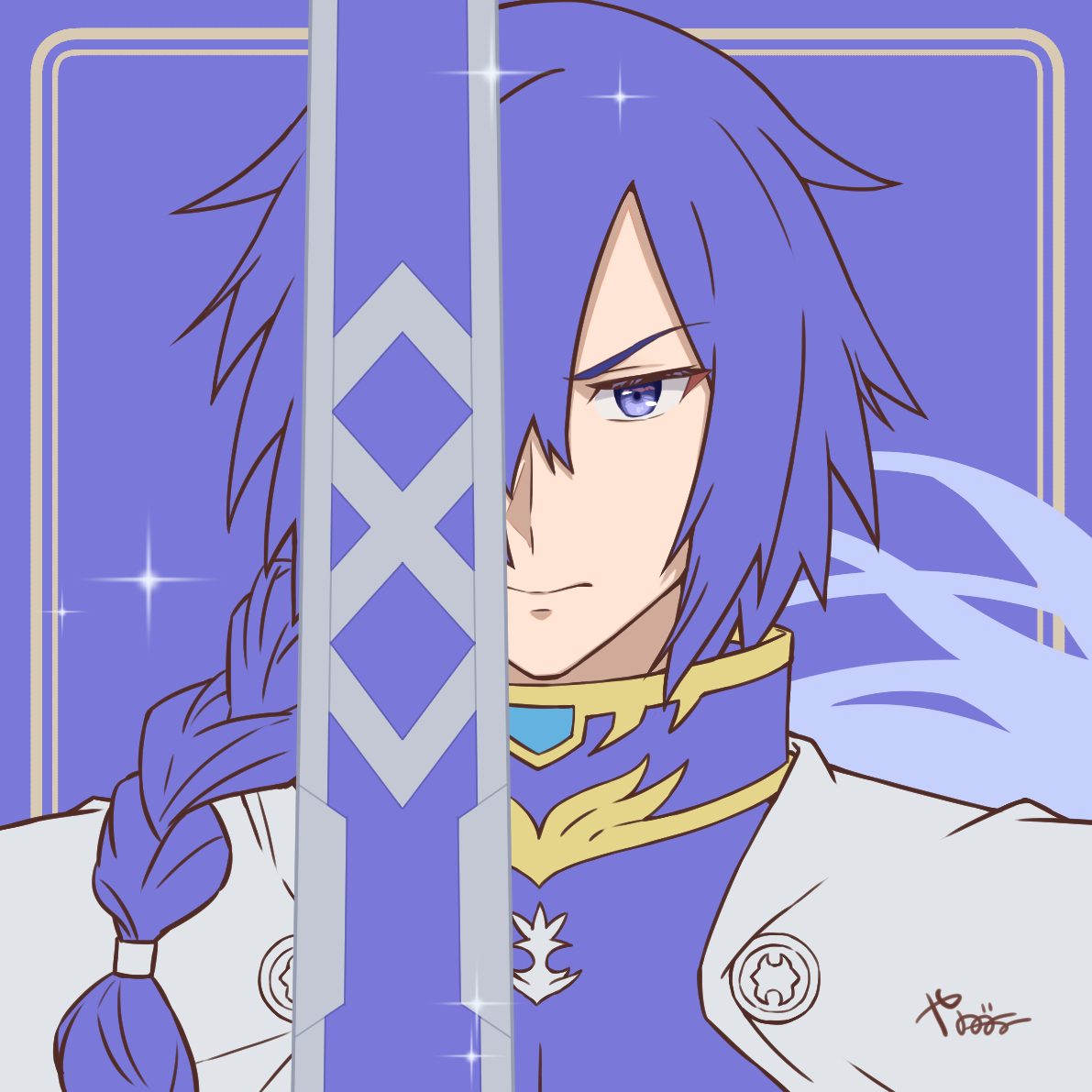 1boy armor blue_armor blue_background braid cape hair_over_one_eye holding holding_sword holding_weapon lowji_mist sentai_red_isekai_de_boukensha_ni_naru simple_background solo sword upper_body weapon white_cape yanagimachi