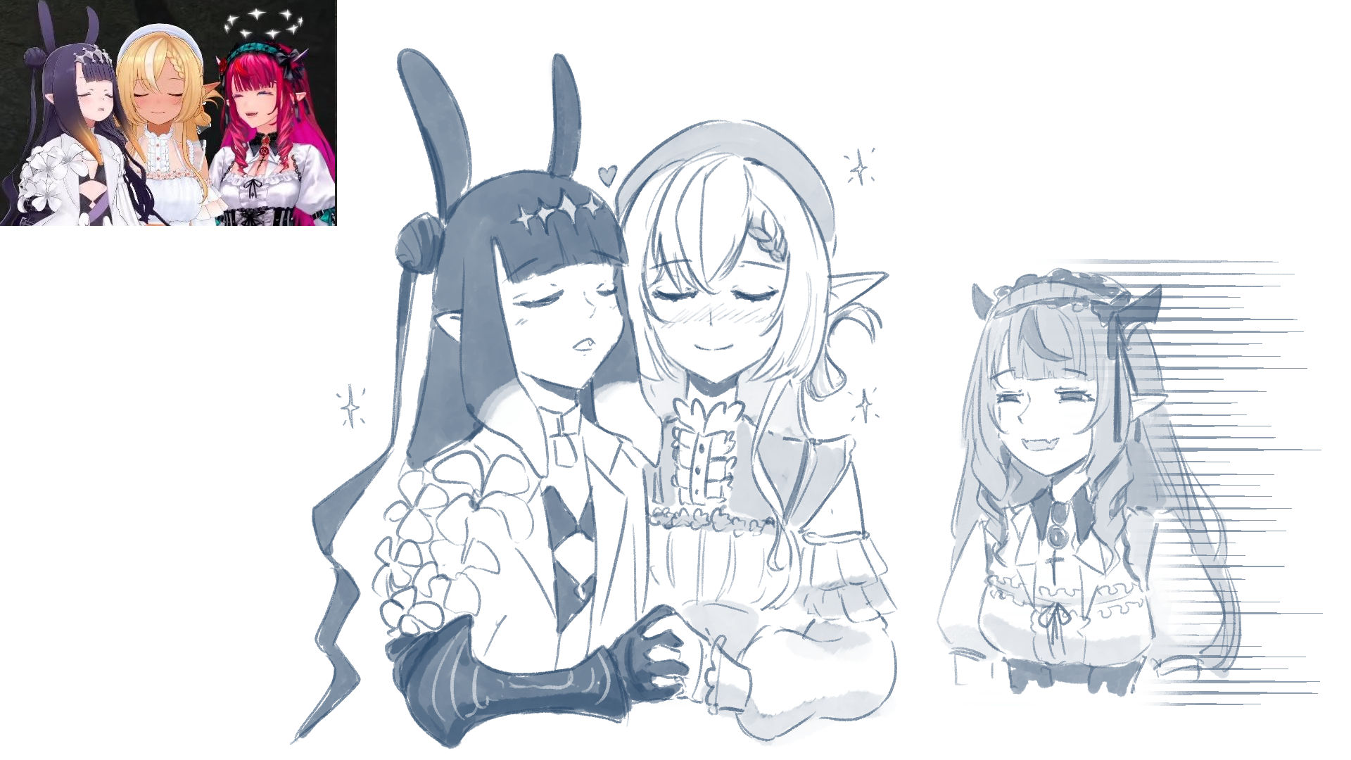 3girls animal_ears beret blunt_bangs blush braid braided_bangs center-flap_bangs commentary detached_sleeves gloom_(expression) greyscale hair_bun half-closed_eyes hat highres holding_hands hololive hololive_english horns imminent_kiss interlocked_fingers irys_(hololive) irys_(maid)_(hololive) long_hair monica_mtna monochrome multiple_girls ninomae_ina'nis ninomae_ina'nis_(ina_the_hero) official_alternate_costume pointy_ears reference_inset shiranui_flare shiranui_flare_(luminous) side_up_bun simple_background untranslatable_commentary two_side_up upper_body virtual_youtuber white_background yuri