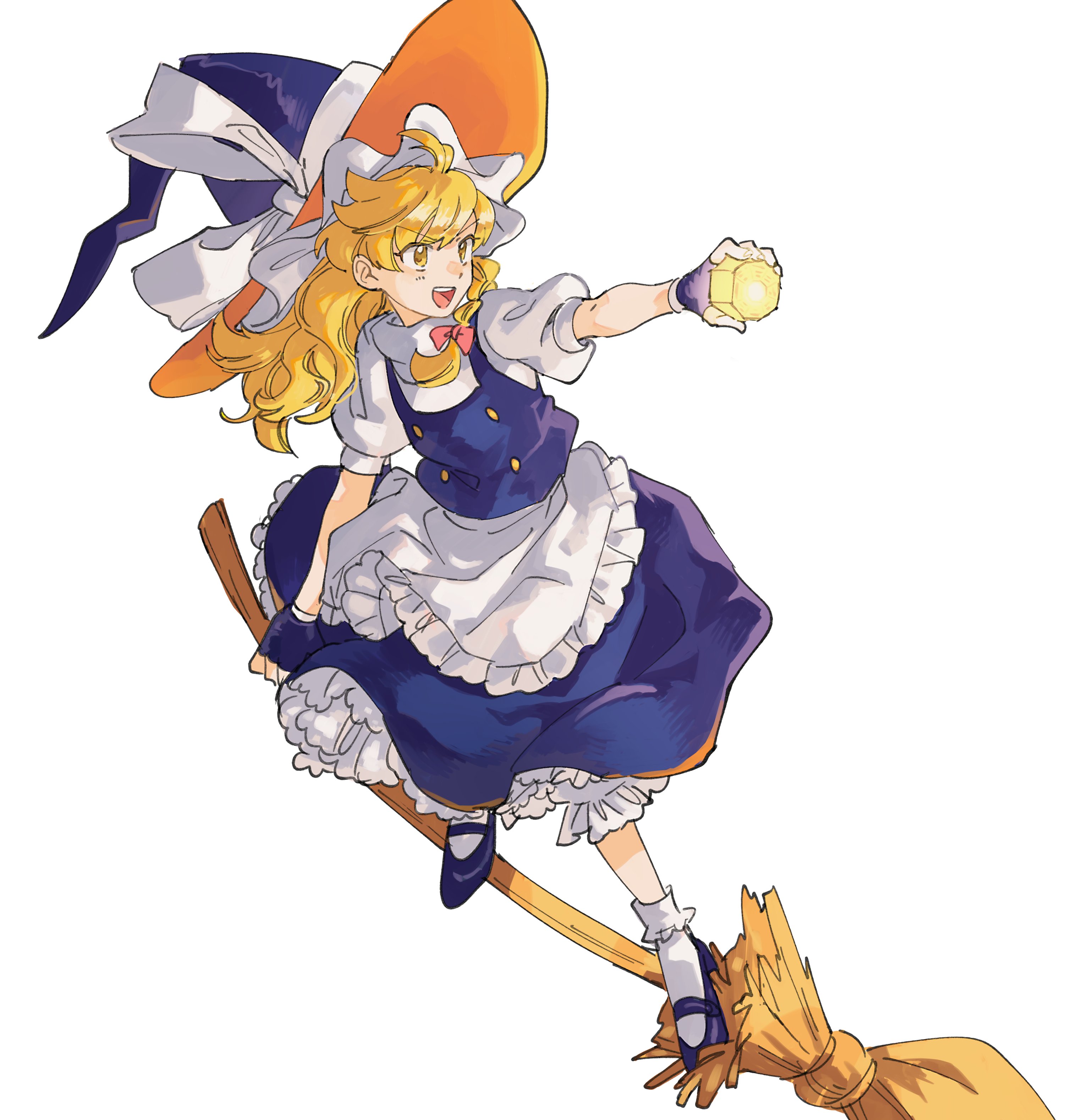 1girl :d absurdres aiming apron black_hat black_shoes black_skirt black_vest blonde_hair bow braid broom broom_surfing buttons commentary glowing glowing_weapon hair_bow hat hat_bow highres holding holding_broom light_blush long_hair looking_to_the_side mary_janes mini-hakkero natsume_(menthol) open_mouth puffy_short_sleeves puffy_sleeves red_bow shirt shoes short_sleeves simple_background single_braid skirt smile socks solo untranslatable_commentary teeth touhou upper_teeth_only vest weapon white_apron white_background white_bow white_shirt white_socks witch_hat yellow_eyes