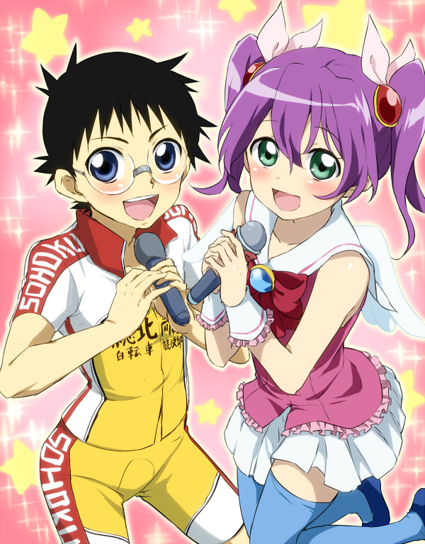 1boy 1girl :d angel_wings bike_jersey bike_shorts black_hair blue_eyes blue_gem blue_shoes blue_thighhighs blush bow bowtie choppy_bangs collarbone commentary_request cowboy_shot cycling_uniform feathered_wings floating frilled_shirt frilled_wrist_cuffs frills gem gem_hair_ornament glasses green_eyes hair_between_eyes hair_bow high_collar himeno_kotori holding holding_microphone jacket koi_no_hime_hime_pettanko legs_apart looking_at_viewer looking_up maruki_(punchiki) medium_hair microphone mini_wings miniskirt official_style onoda_sakamichi open_mouth outer_glow partially_unzipped pink_background pink_shirt purple_eyes raised_eyebrows red_bow red_bowtie red_gem round_eyewear sailor_collar shirt shoes short_hair short_sleeves short_twintails shorts skirt sleeveless sleeveless_shirt smile sparkle star_(symbol) star_symbol_background teeth thighhighs thighs_together twintails upper_teeth_only very_short_hair white_bow white_sailor_collar white_skirt white_wings white_wrist_cuffs wings wrist_cuffs yellow_jacket yellow_shorts yowamushi_pedal zettai_ryouiki