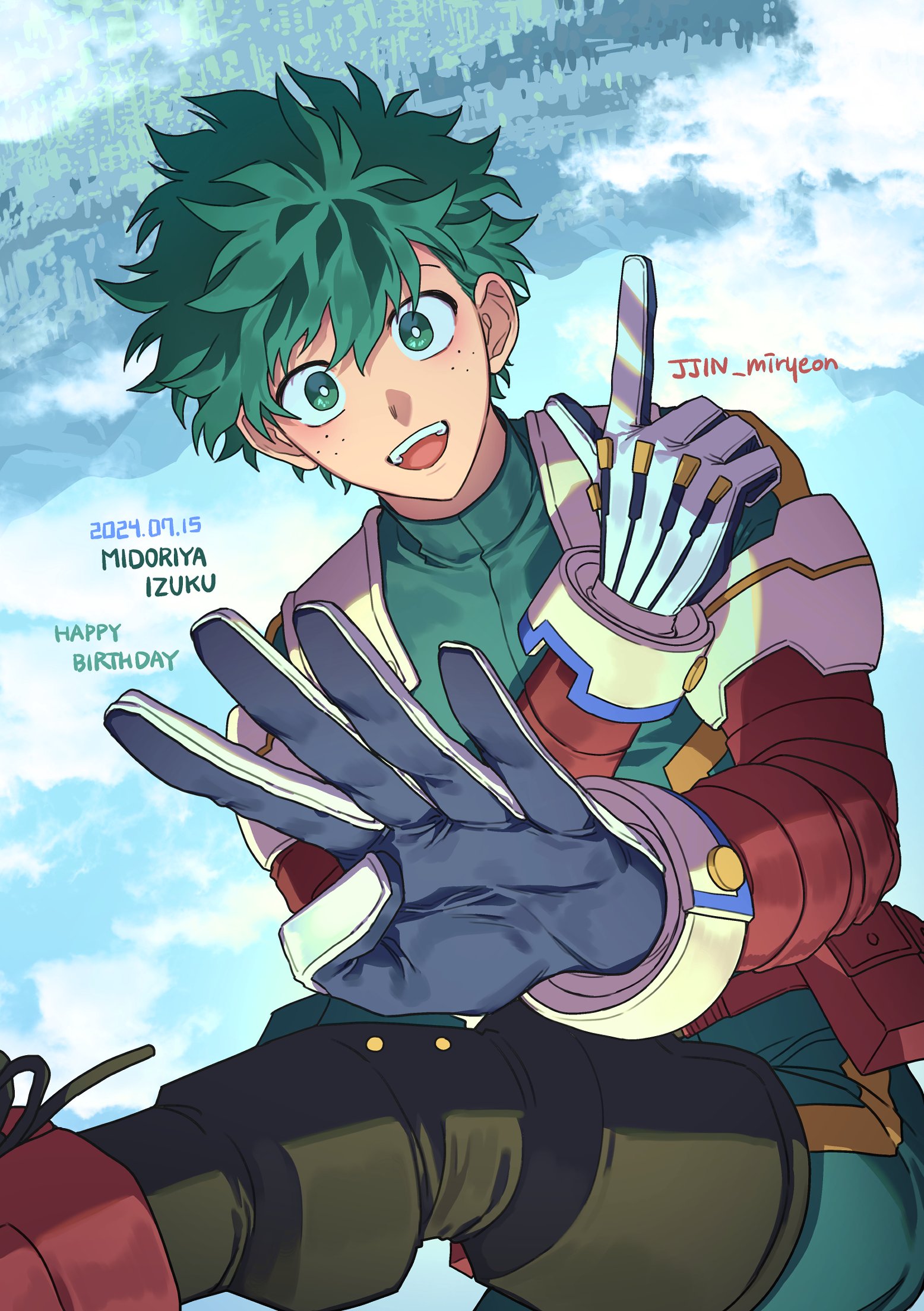 1boy blue_background boku_no_hero_academia bright_pupils character_name dated finger_counting freckles gloves green_eyes green_hair happy_birthday highres looking_at_viewer male_focus midoriya_izuku misa_(jjin_miryeon) open_mouth short_hair sky solo white_gloves white_pupils