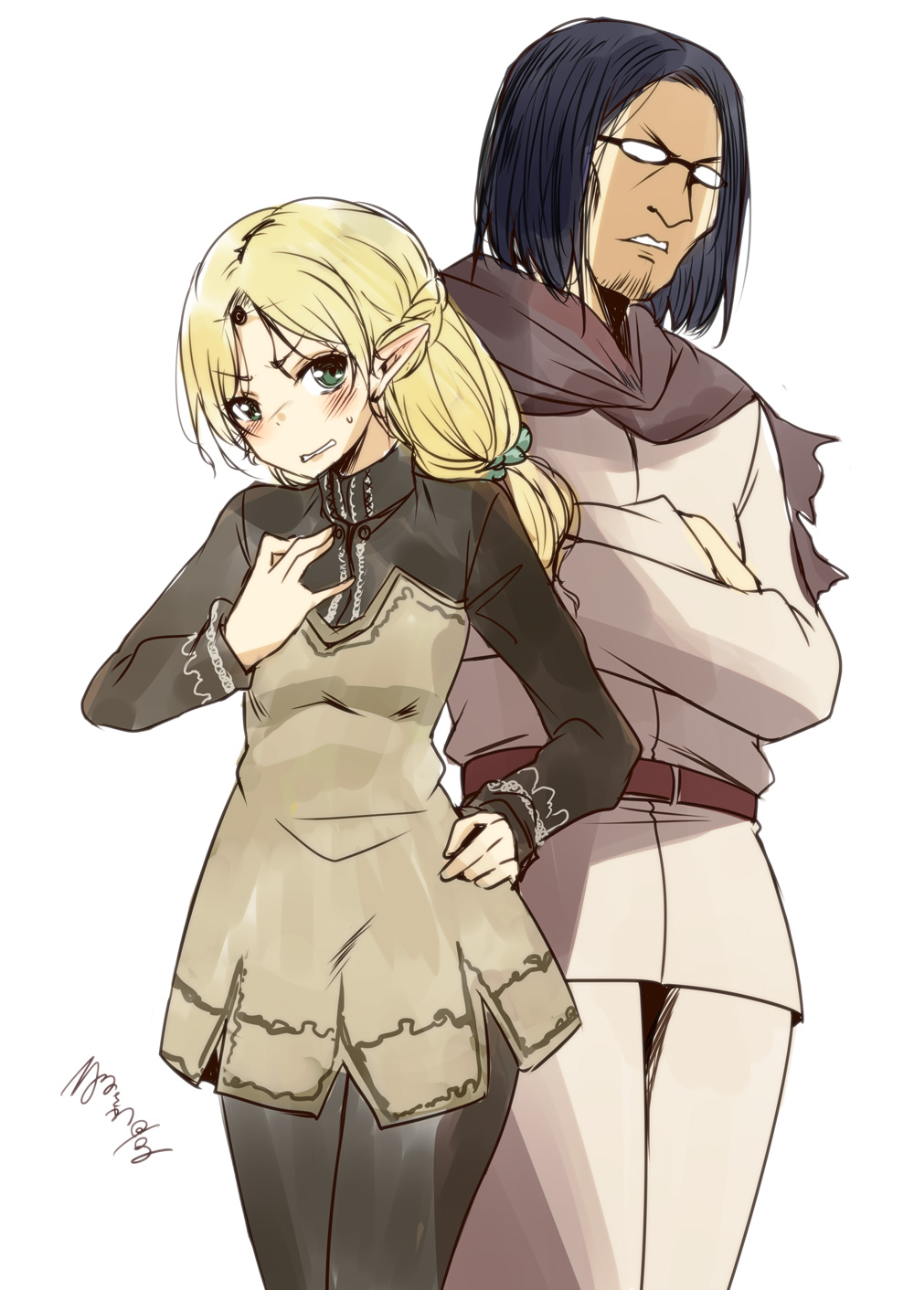 1boy 1girl black_hair blonde_hair elf highres isekai_ojisan pointy_ears shibazaki_yousuke sui_(isekai_ojisan)