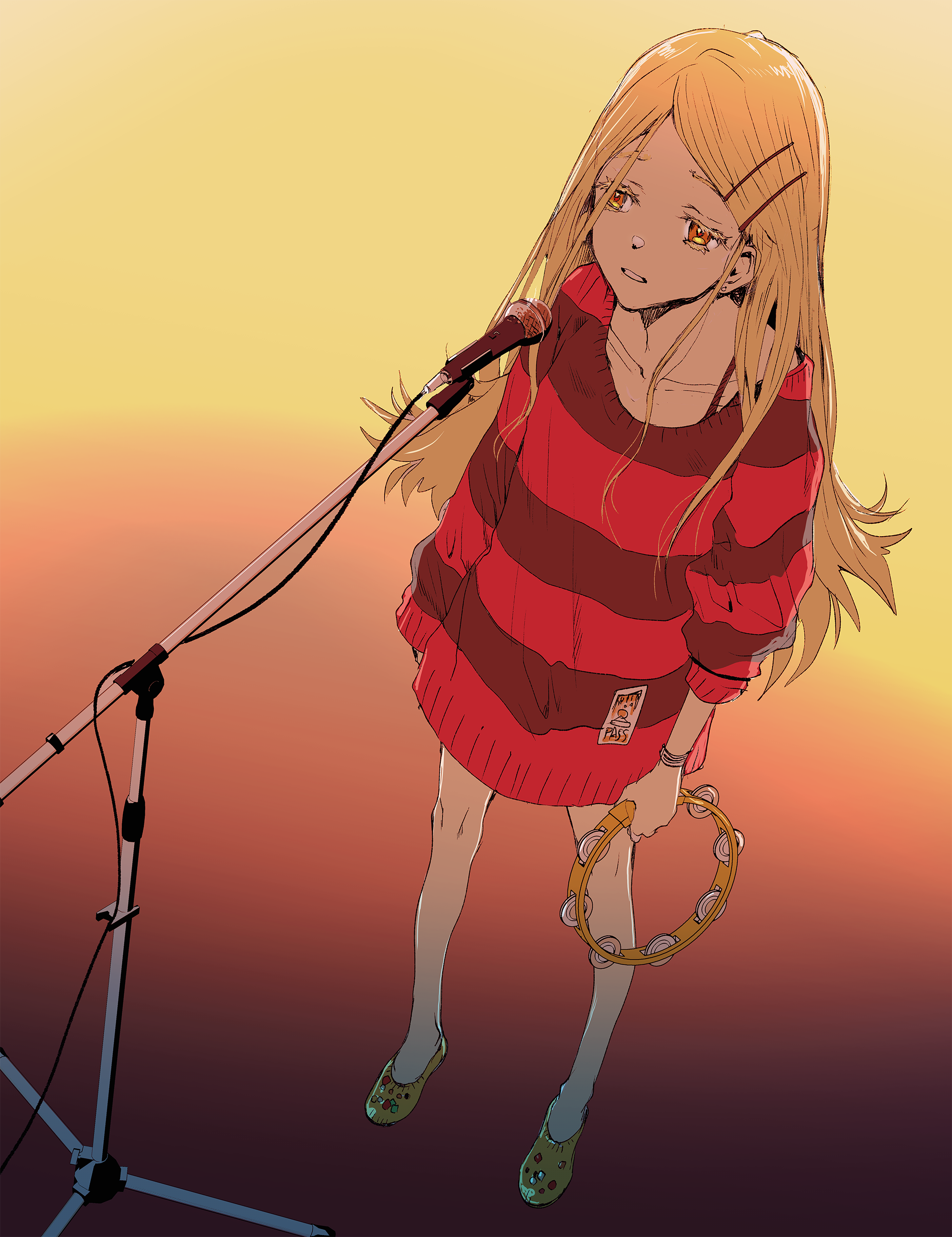 1girl absurdres blonde_hair commentary_request dress flat_chest full_body gakuen_idolmaster gradient_background highres idolmaster instrument long_hair microphone microphone_stand orange_eyes parted_lips shinosawa_hiro solo sunfaded_(idolmaster) sweater sweater_dress tamaoki_benkyou tambourine