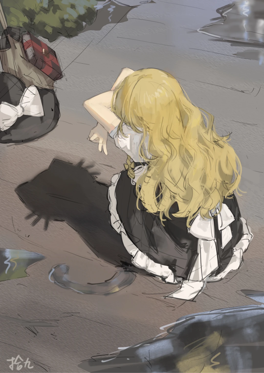 1girl back_bow black_hat black_skirt blonde_hair book bow broom cat_shadow_puppet_(meme) frilled_skirt frills hat hat_bow highres kirisame_marisa long_hair meme missing_headwear puddle puffy_short_sleeves puffy_sleeves shadow shijiu_(shizuoxing) shirt short_sleeves signature skirt solo touhou unworn_headwear white_bow white_shirt witch_hat