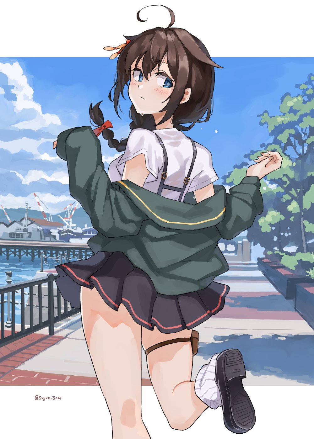 1girl ahoge black_hair black_skirt blue_eyes blue_sky braid cloud commentary_request day from_behind green_jacket hair_flaps hair_over_shoulder highres jacket kantai_collection looking_at_viewer looking_back official_alternate_costume outdoors pleated_skirt railing shigure_(kancolle) shigure_(kure_2025)_(kancolle) shigure_kai_san_(kancolle) shirt single_braid skirt sky solo sugue_tettou suspenders thigh_strap white_shirt
